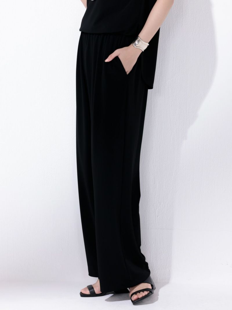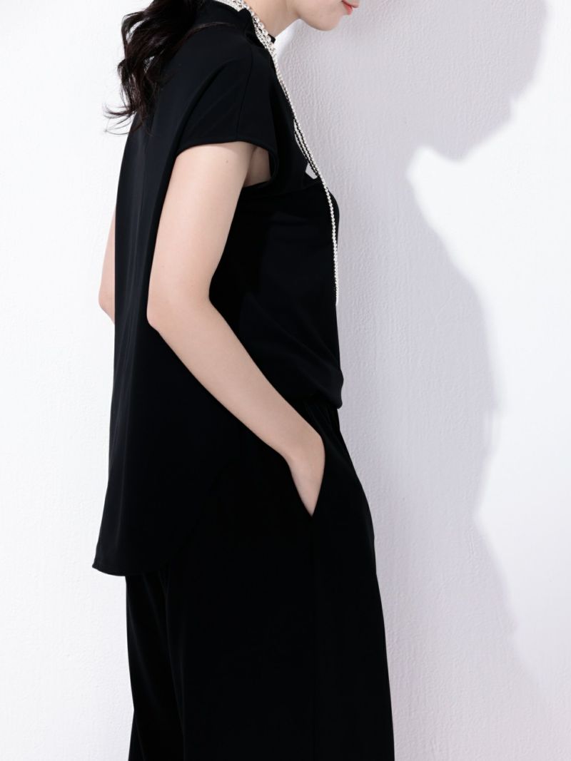上品なブラックカラーが、アクセサリーや小物次第で表情を変え、