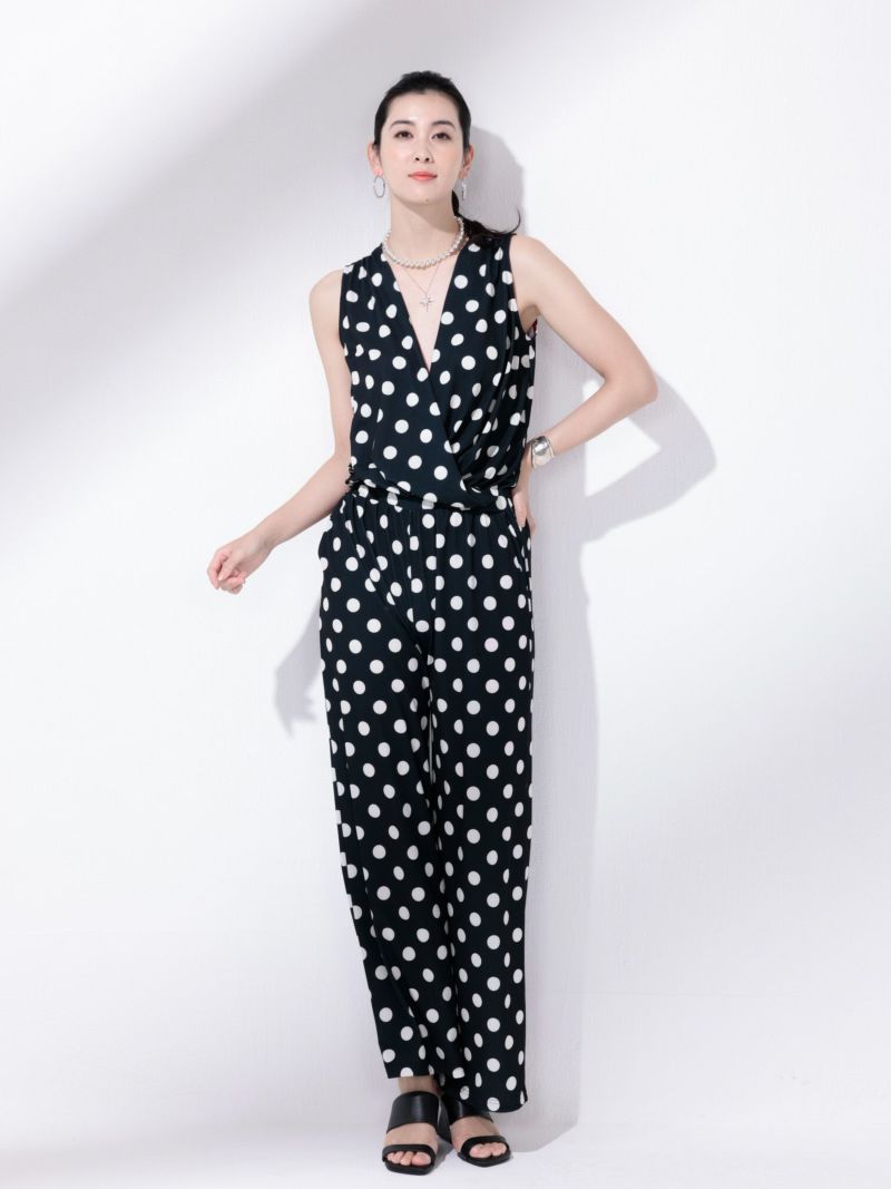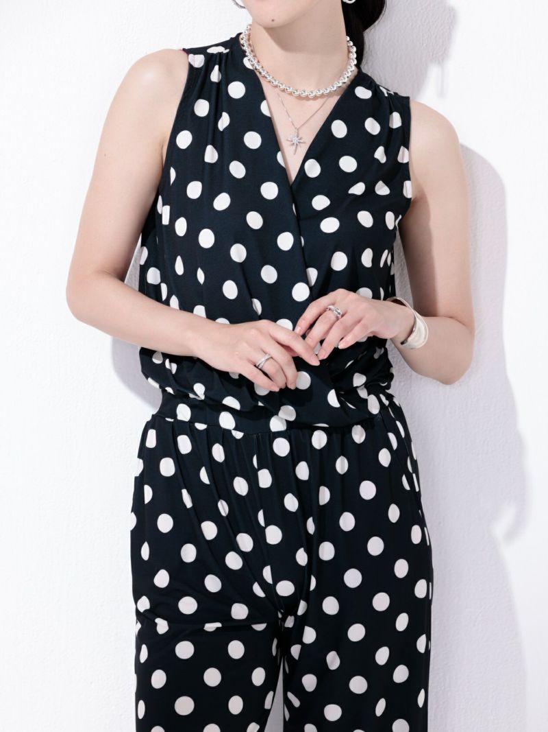 大胆なドットプリントが目を引く、カシュクールオールインワン。