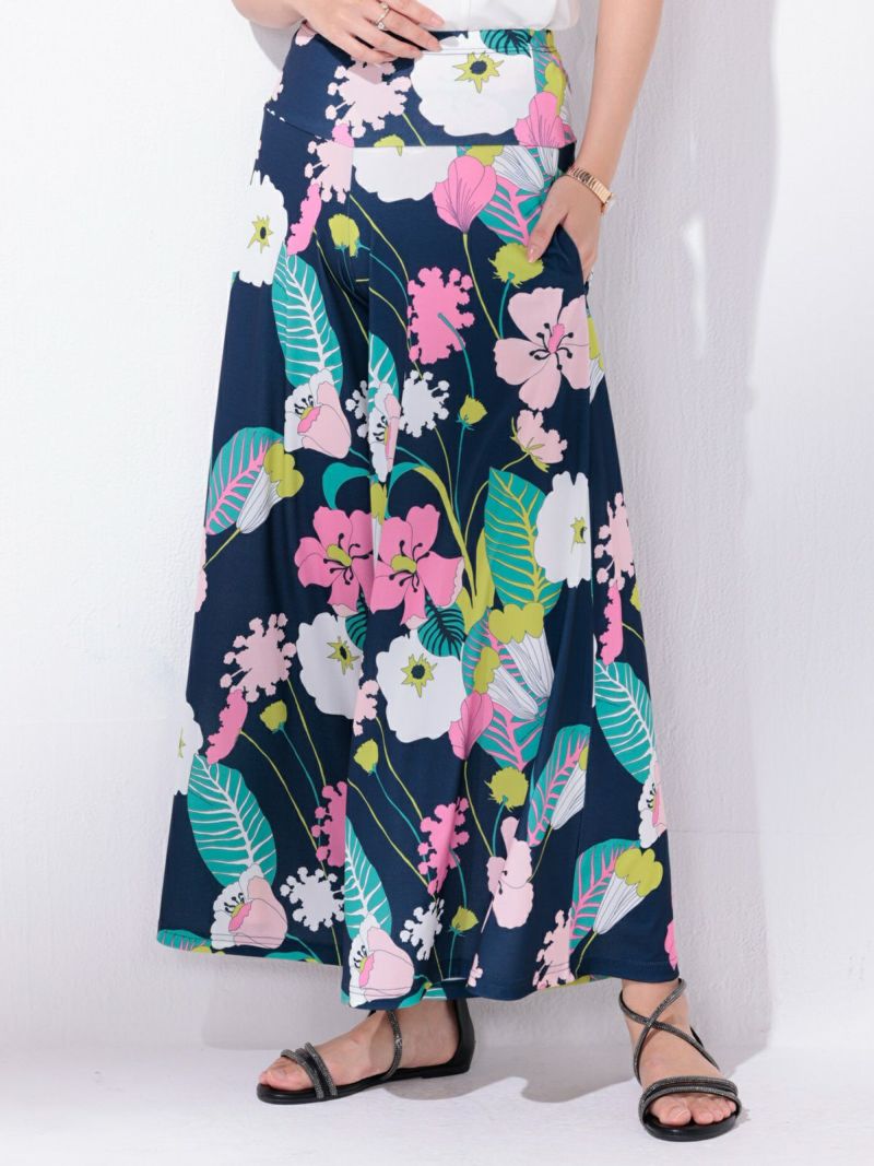 大胆で華やかなフラワープリントが視線を惹きつけるガウチョパンツ。