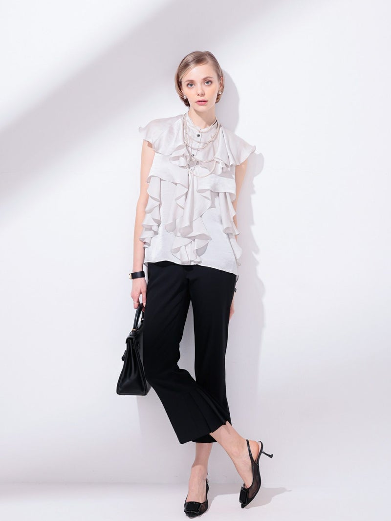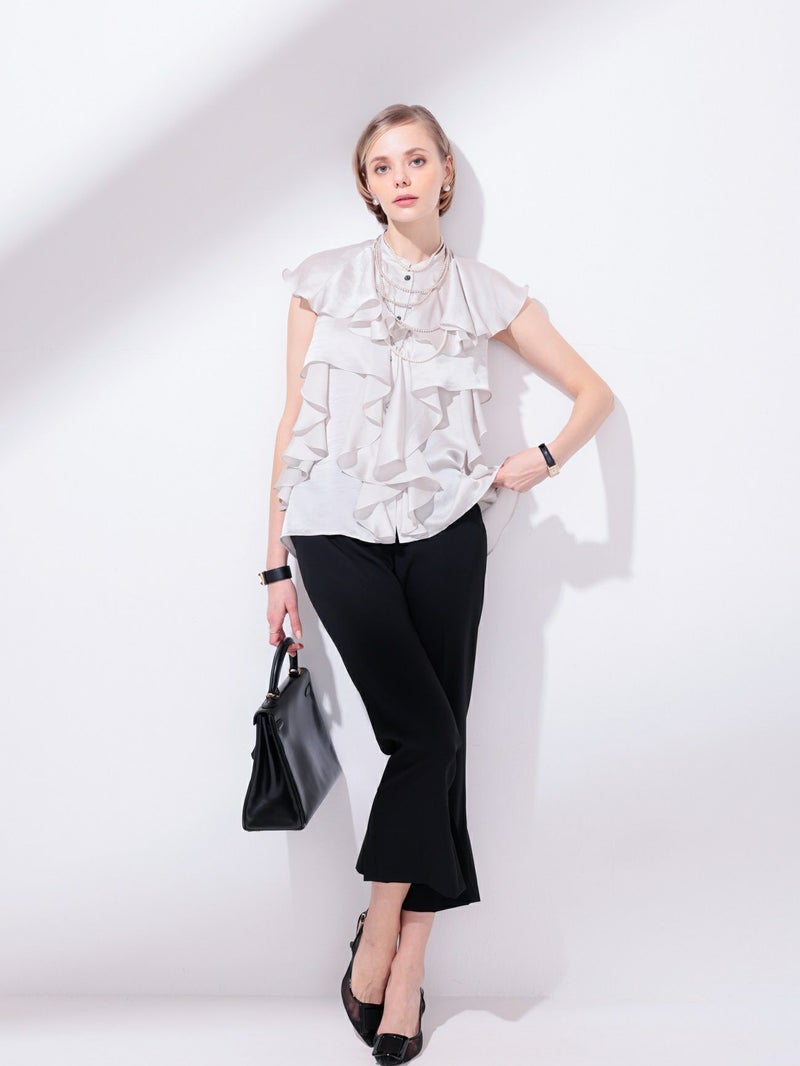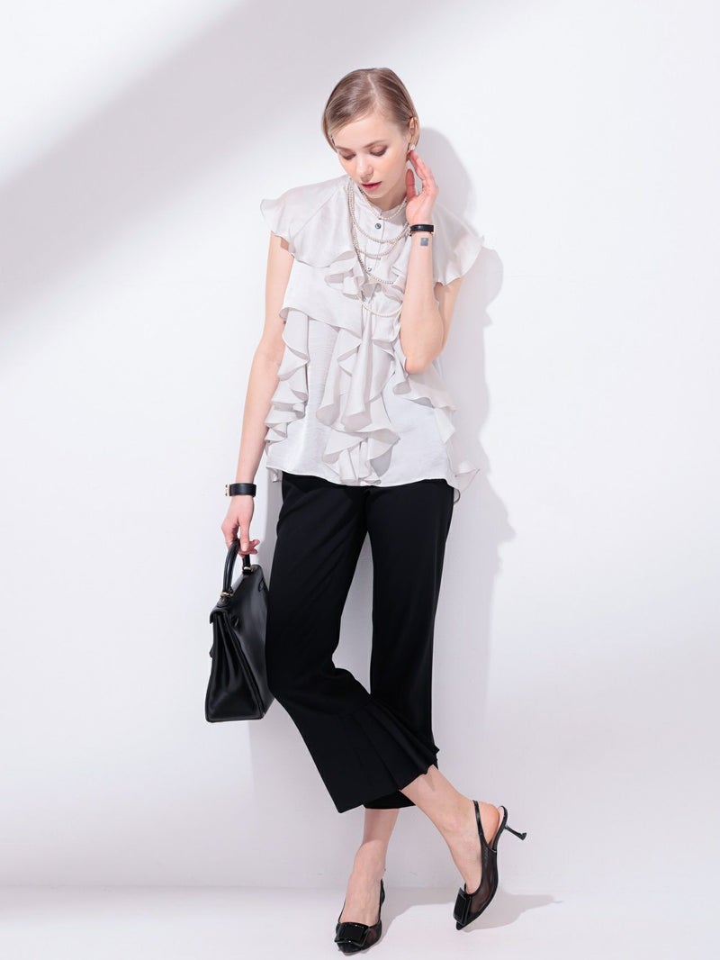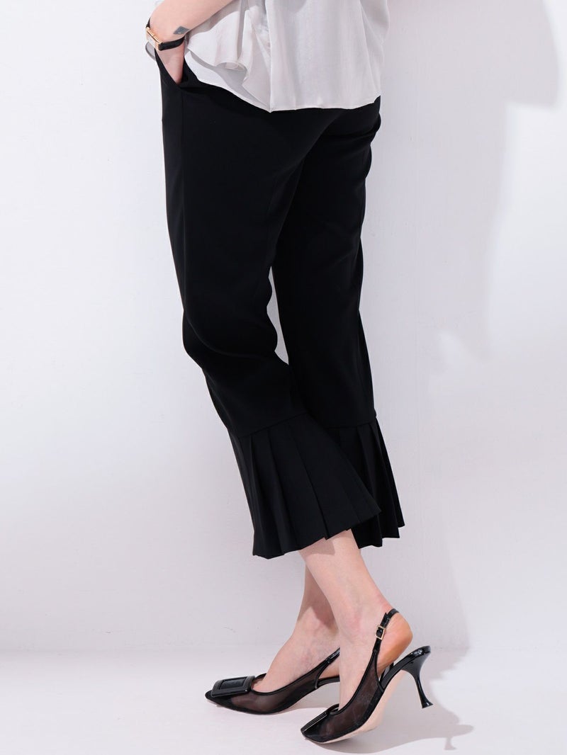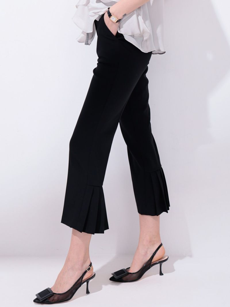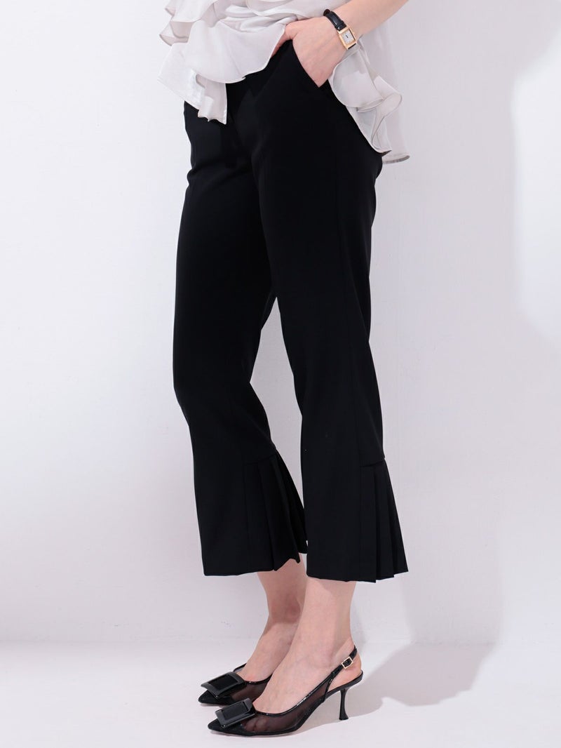 足元をすっきりと見せるクロップド丈で、ヒールからフラットシューズまで幅広いスタイリングに対応。