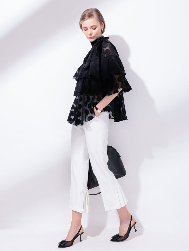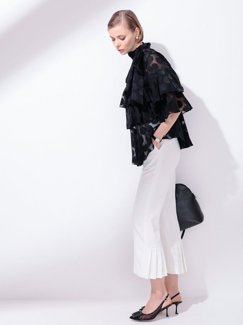 ミニマルなシルエットに、裾のプリーツディテールが映える一着。
