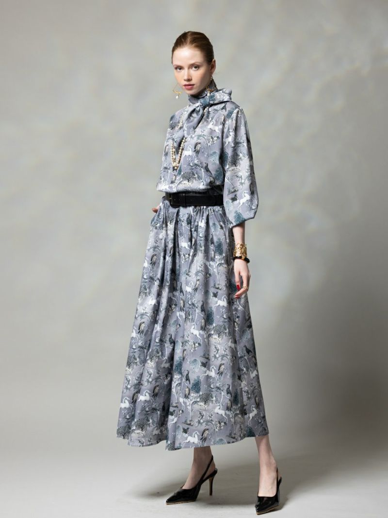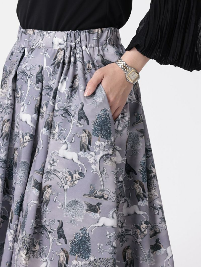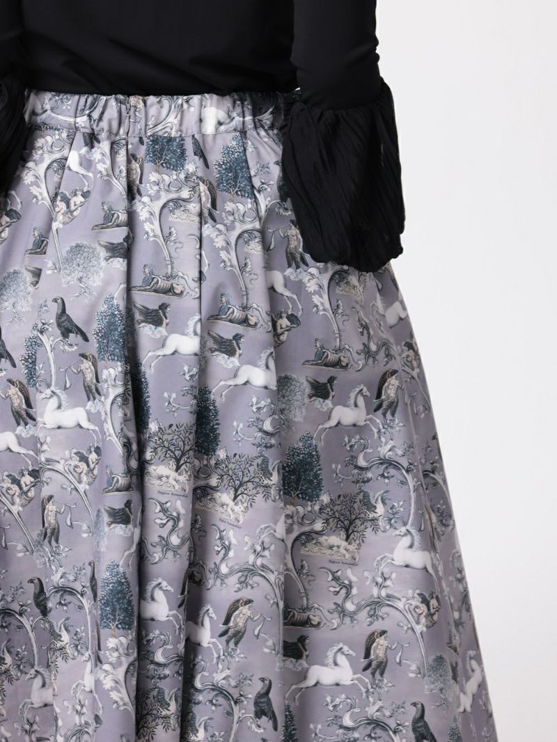 神話から登場したようなコラージュプリントのタフタスカート。