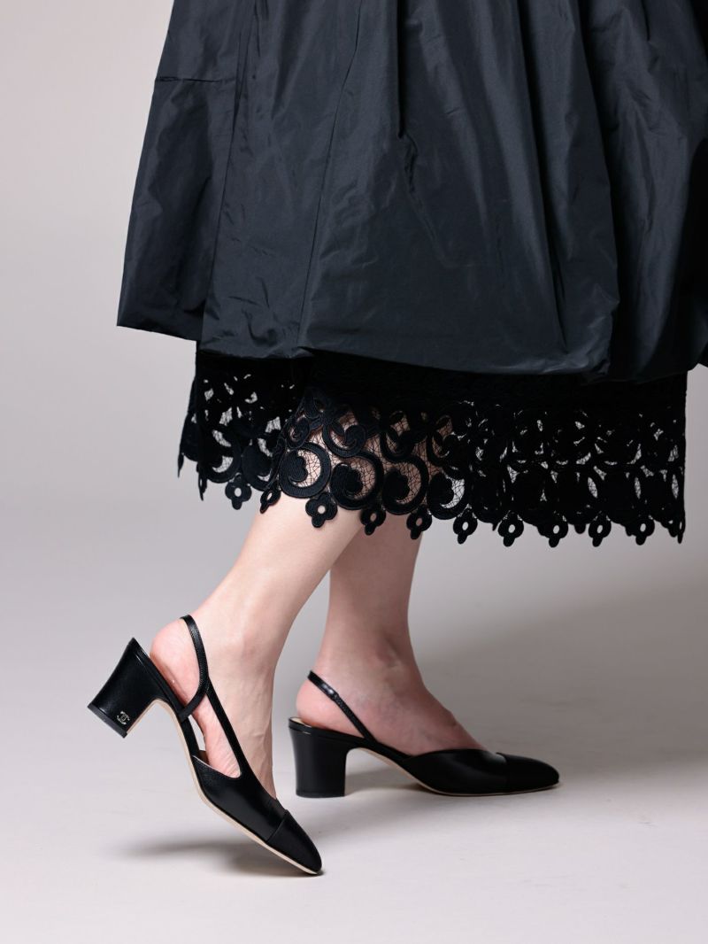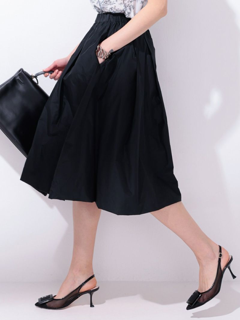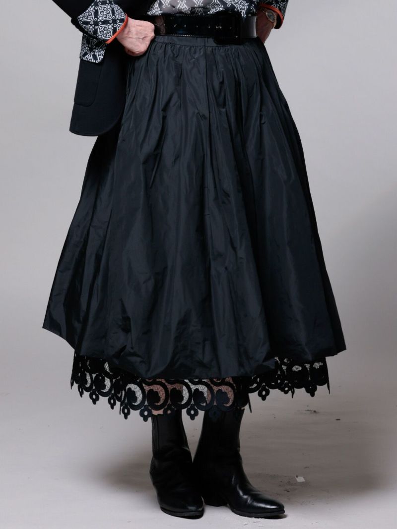 シャンブレー素材のバルーンスカートを重ねたスタイリング。