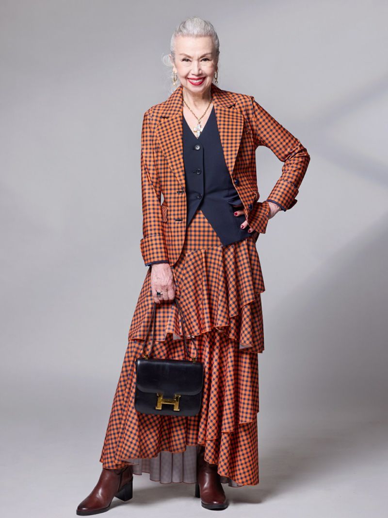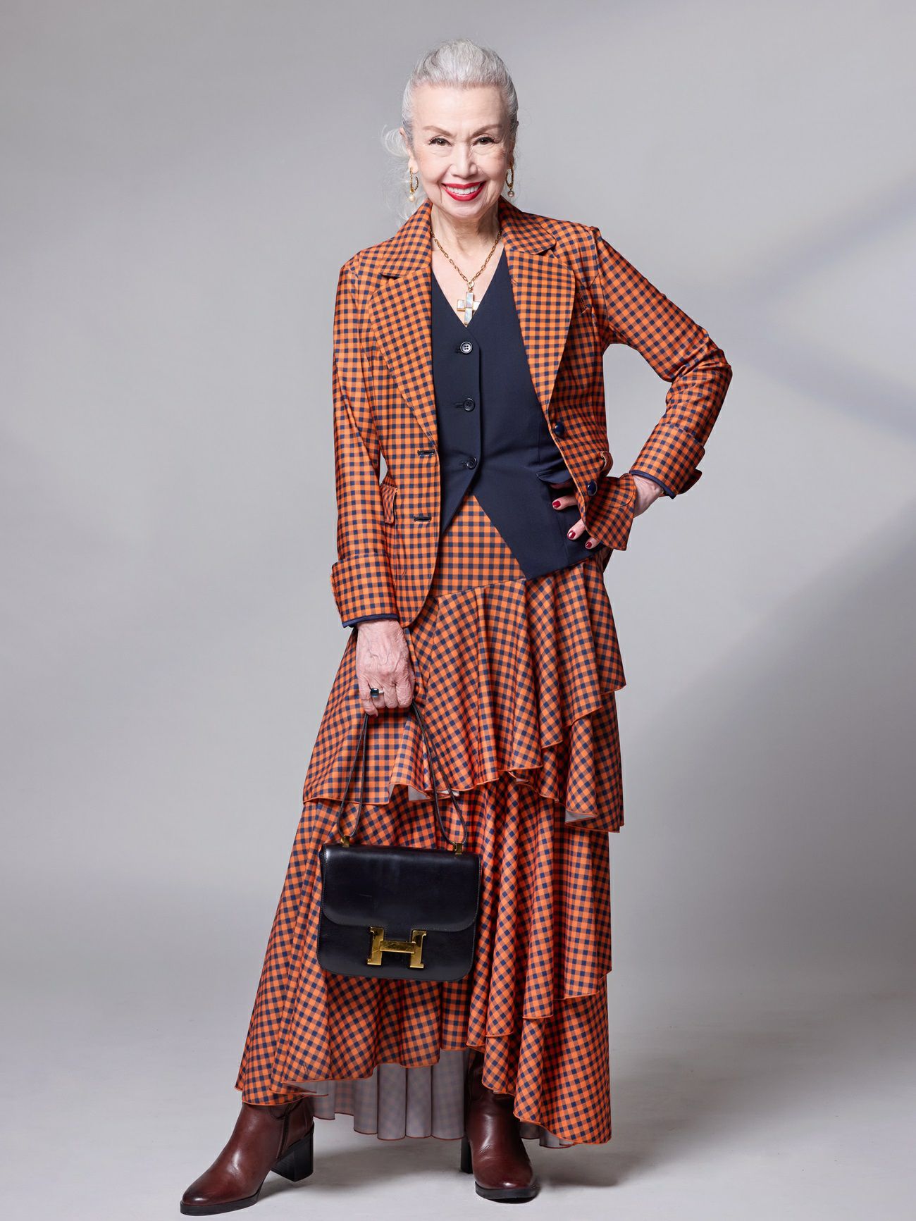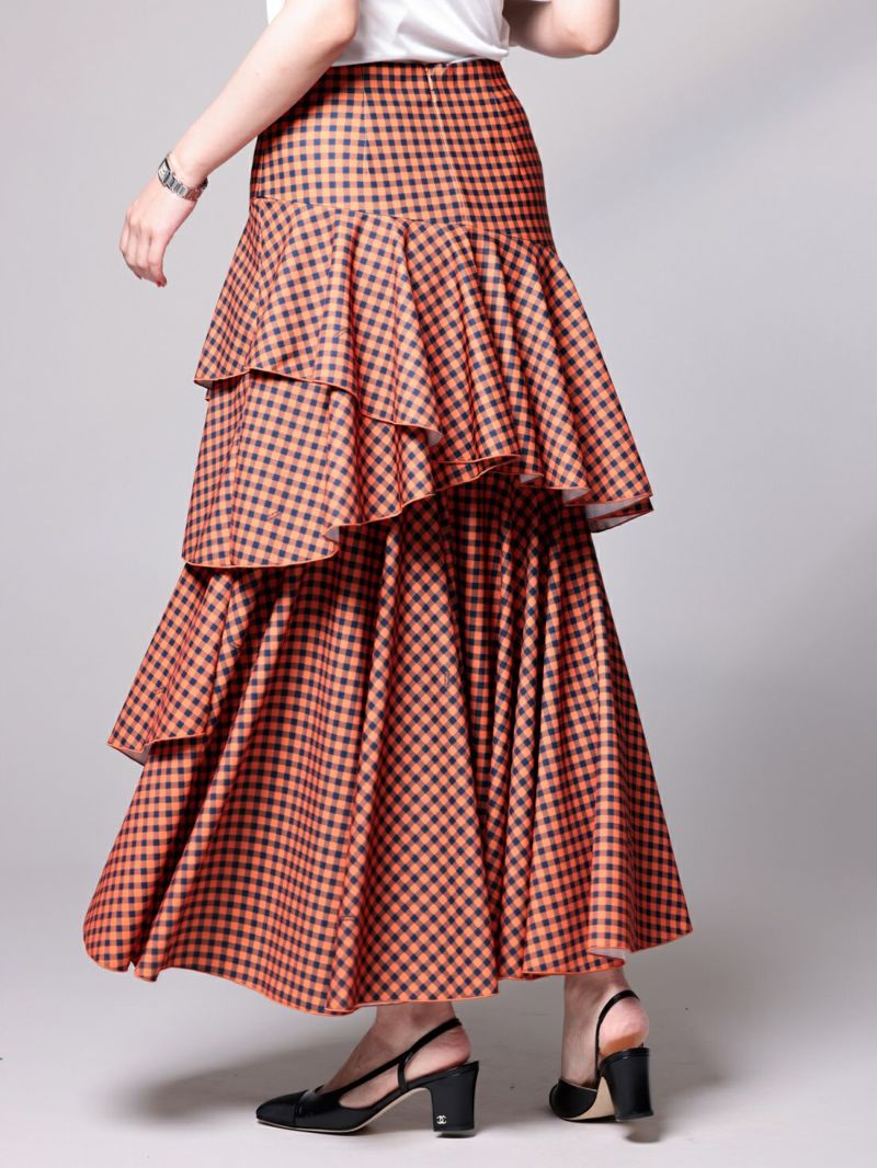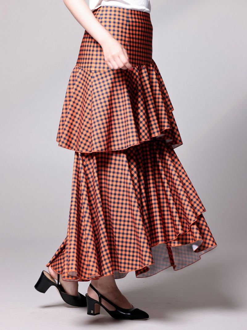 オレンジ×ネイビーのギンガムチェックが印象的なティアードスカート。
