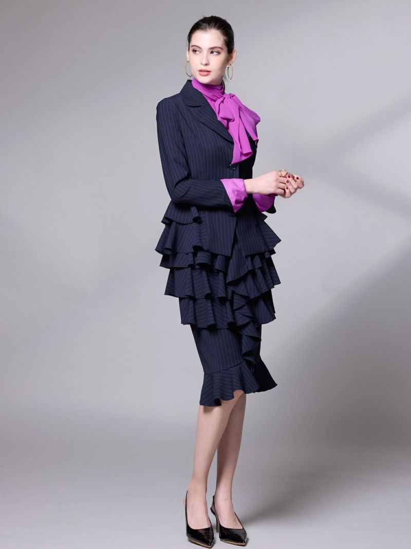端正なピンストライプに、大胆なフリルがリズムを生むデザイン。