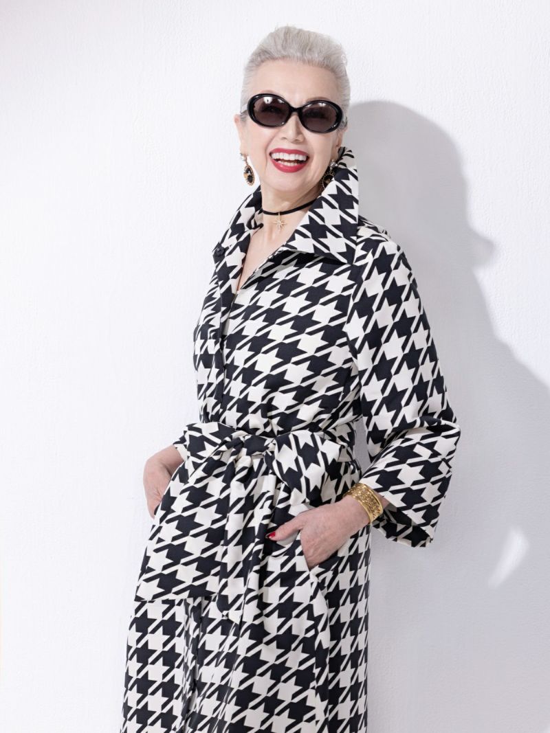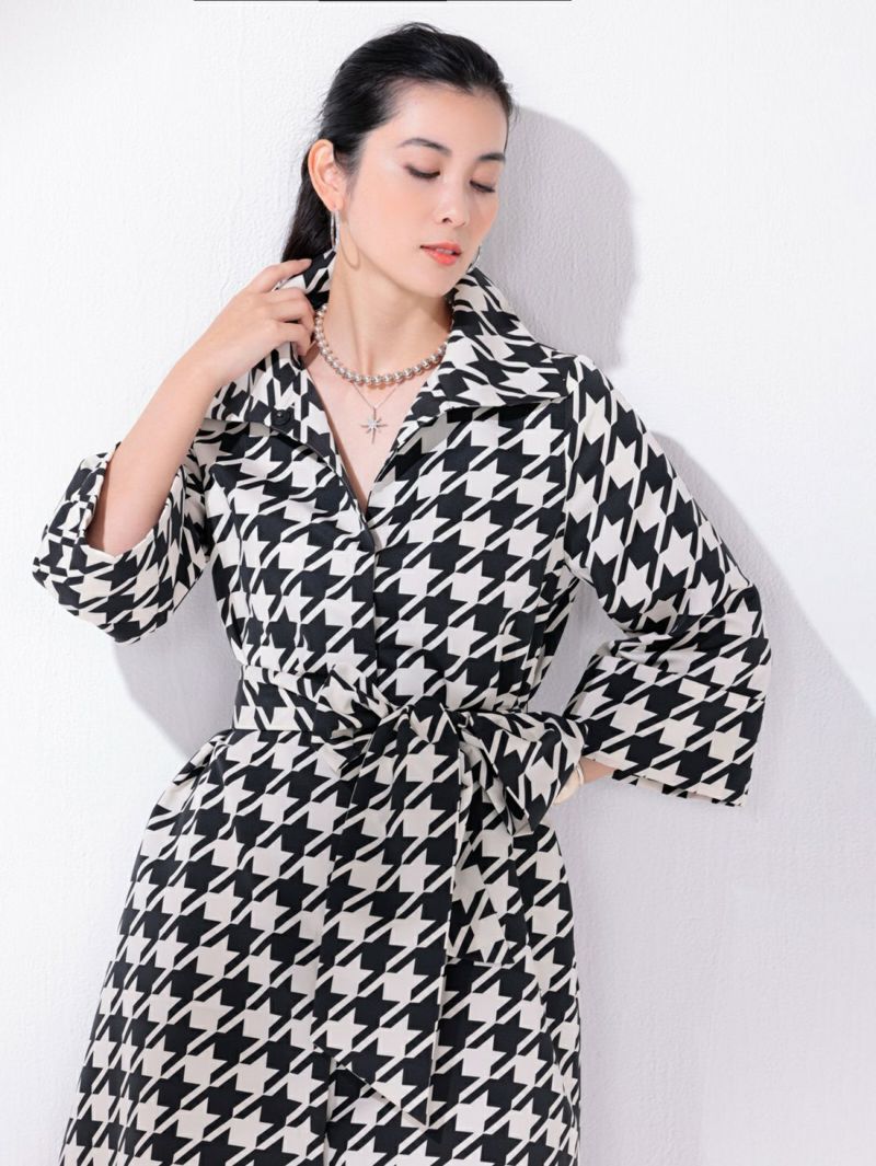 気分を盛り上げる千鳥格子柄のクラシカルなコートワンピース。