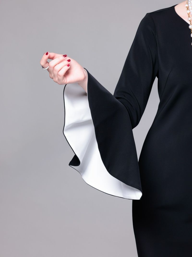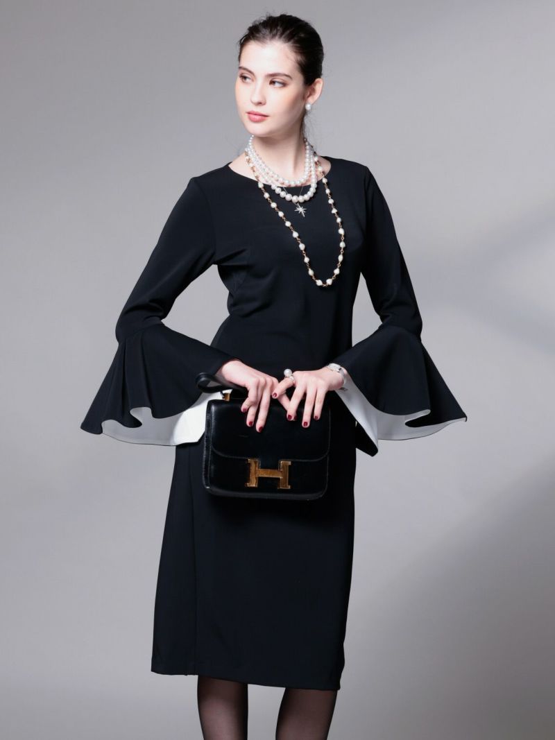 美しく広がる袖フレアが印象的なブラックドレス。