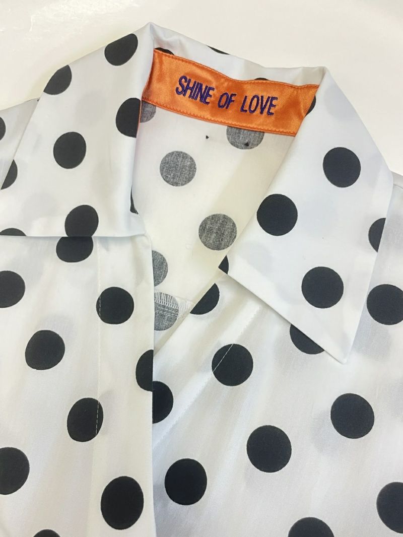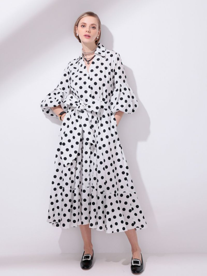 クラシカルなホワイトドットが映える、フェミニンなシャツワンピース。