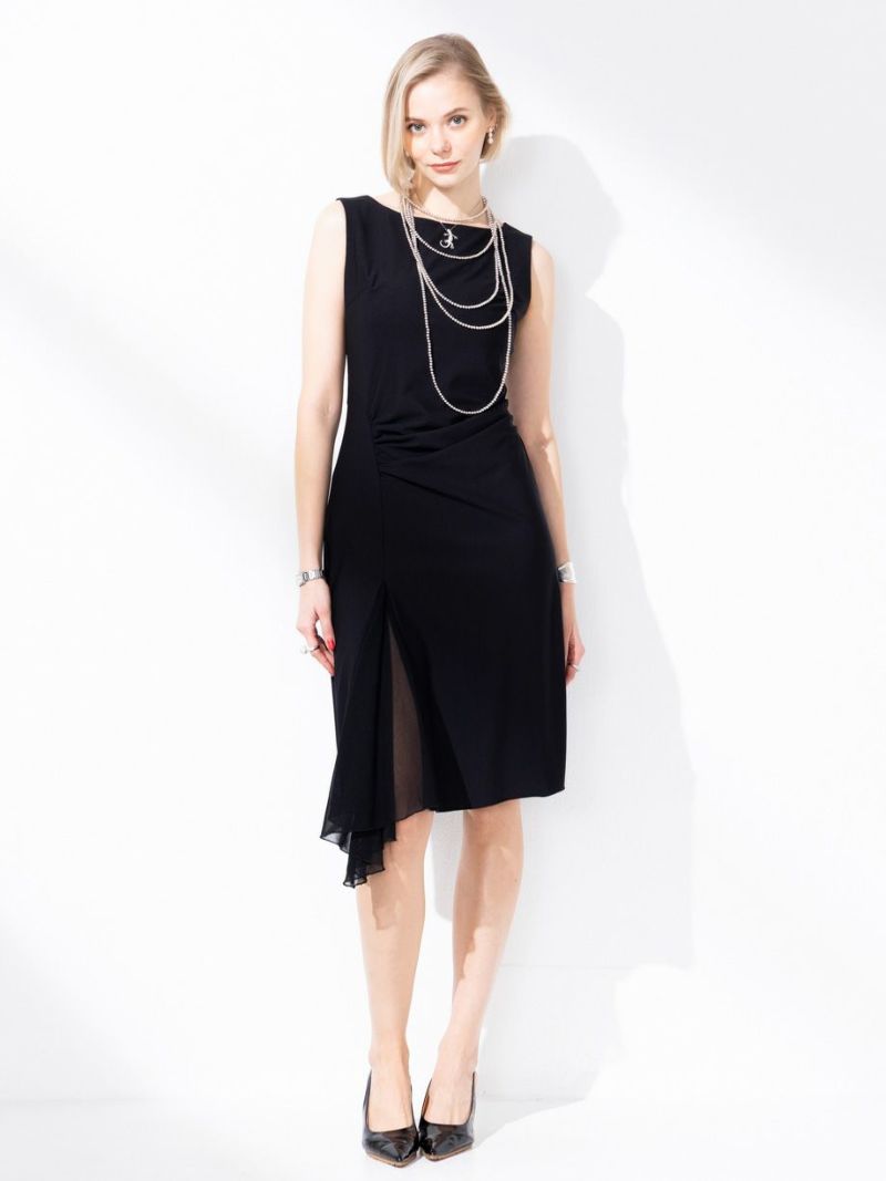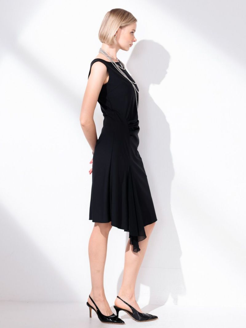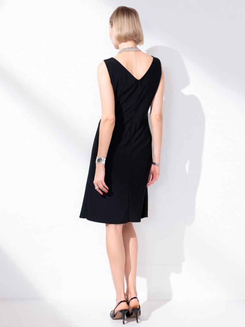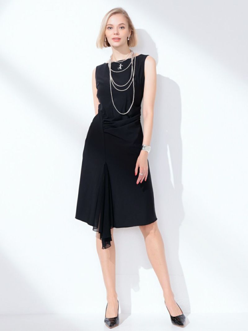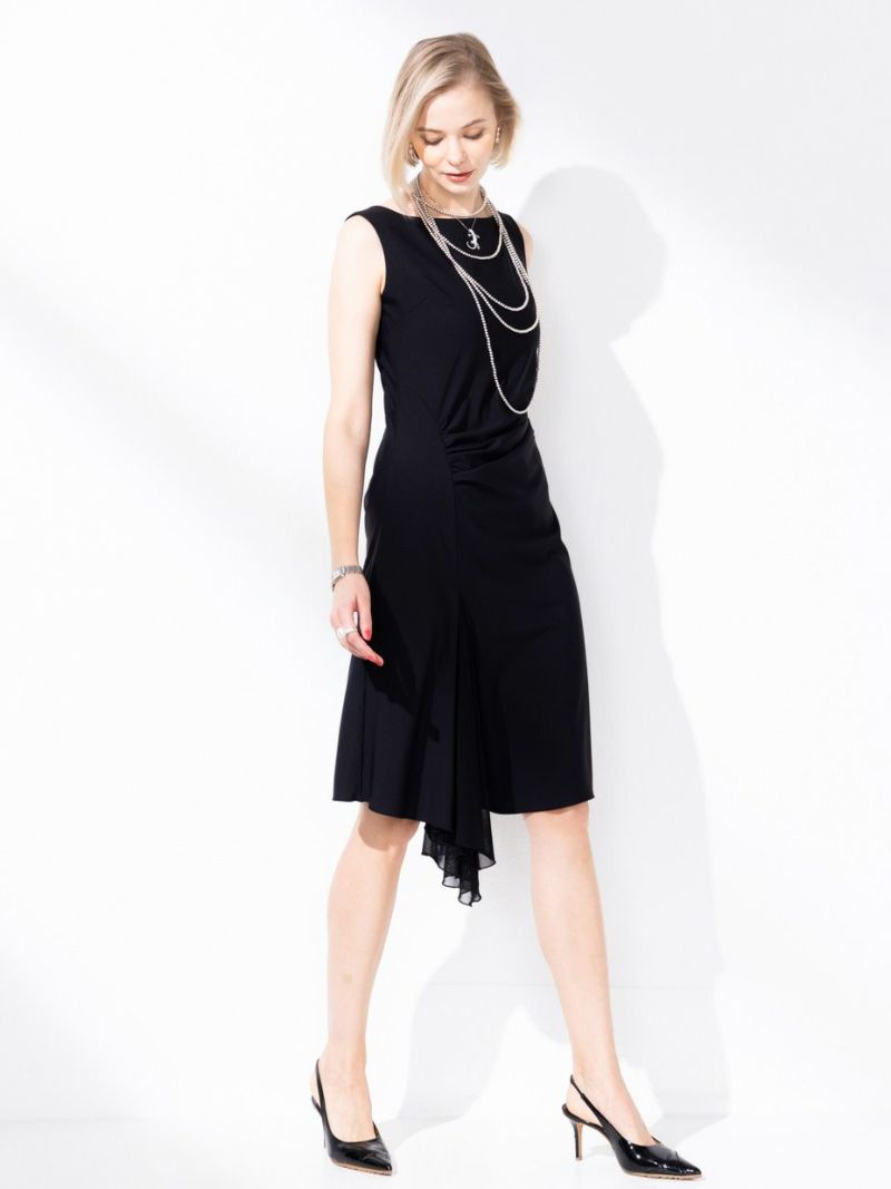 ブラックに潜むチュールの揺らめきが、上品な抜け感を作るワンピース。