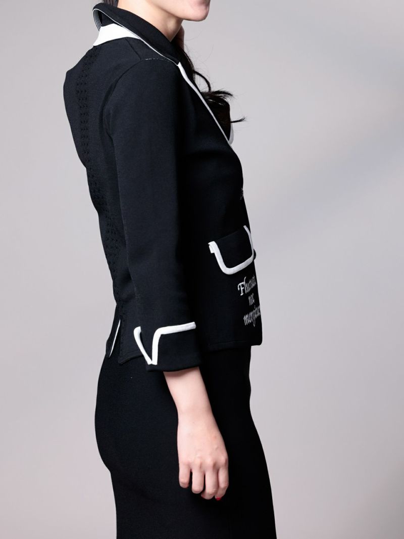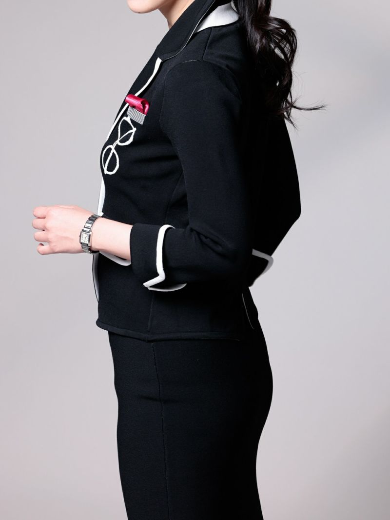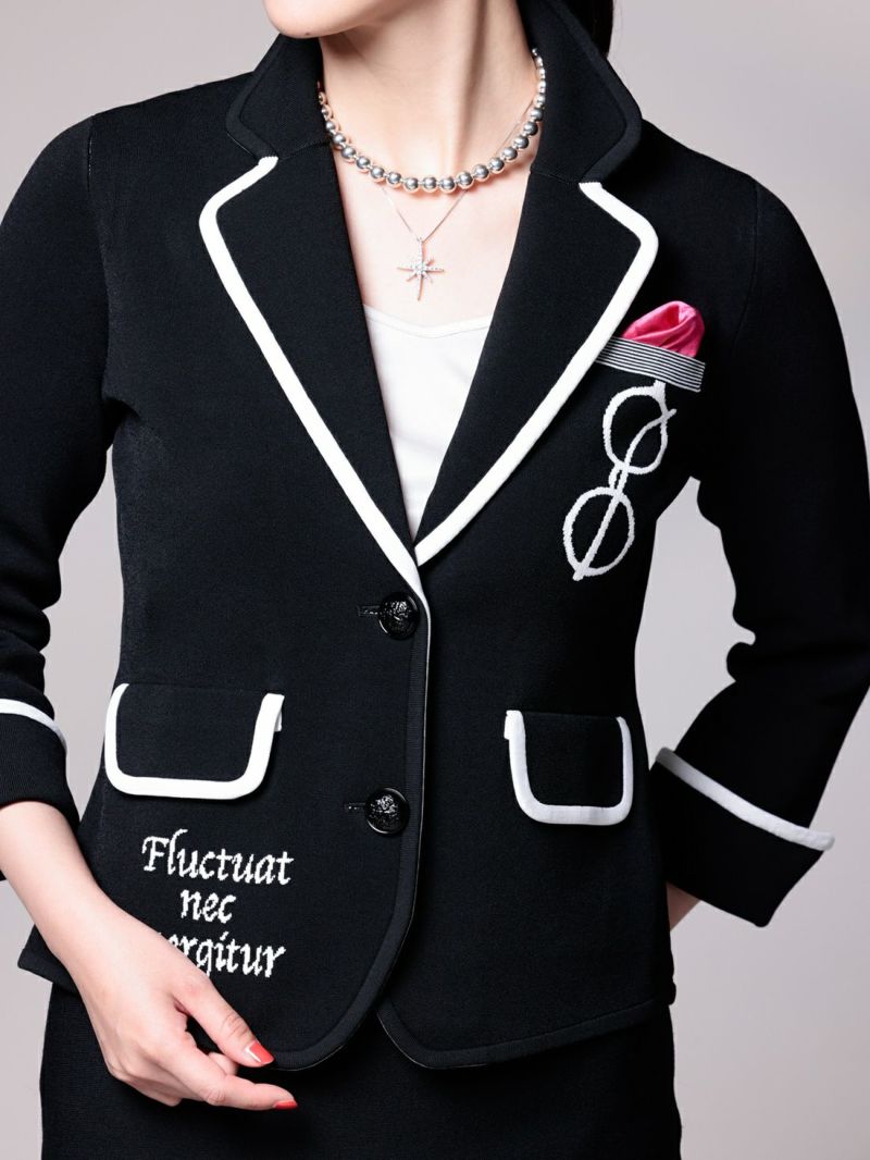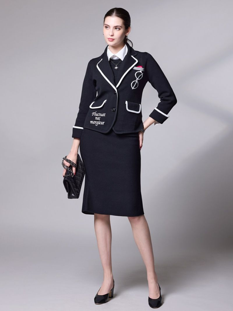 モノトーンの配色と、クラシカルなディテールが光るニットスーツ。