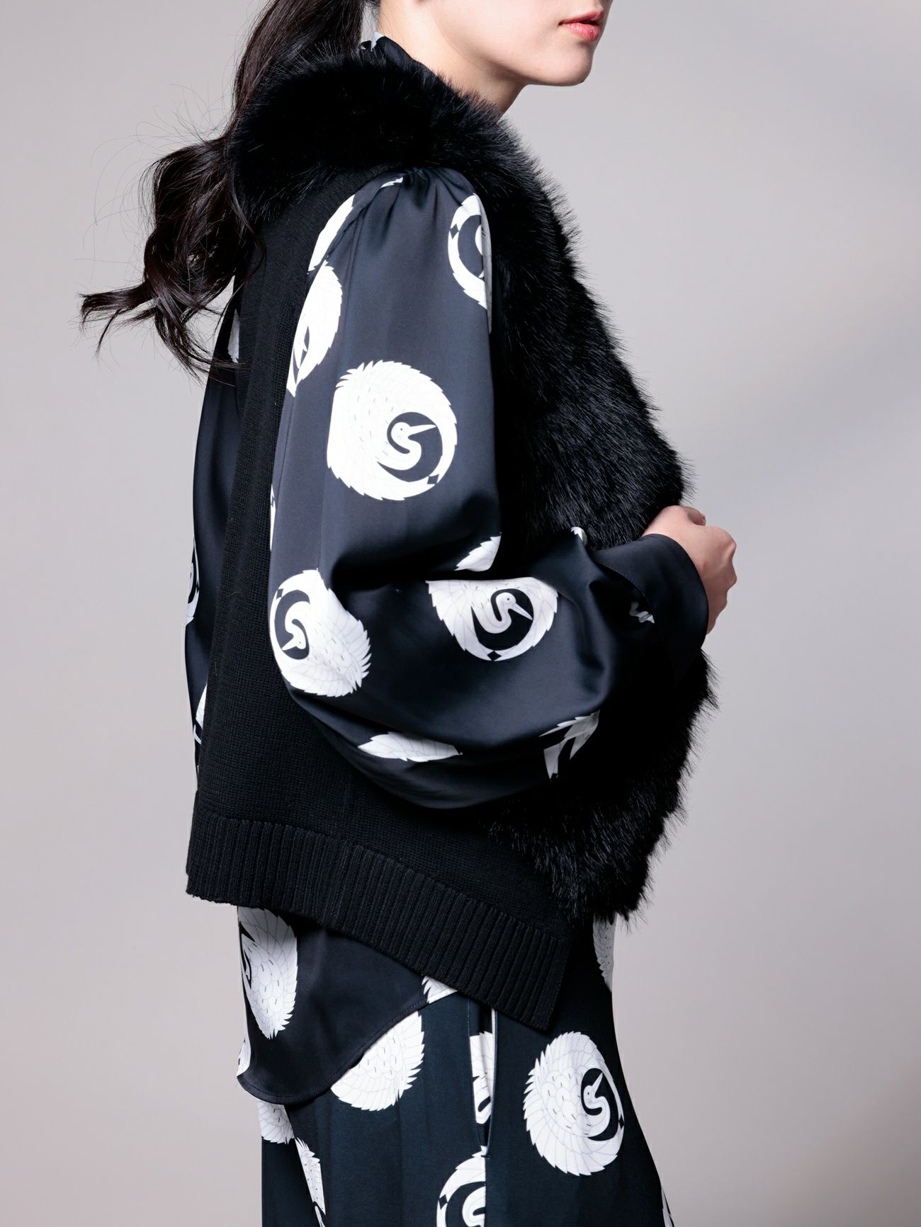 ニットファーベストが黒のリブニットに立体感をプラス。