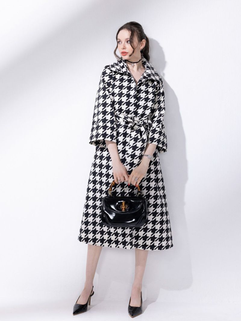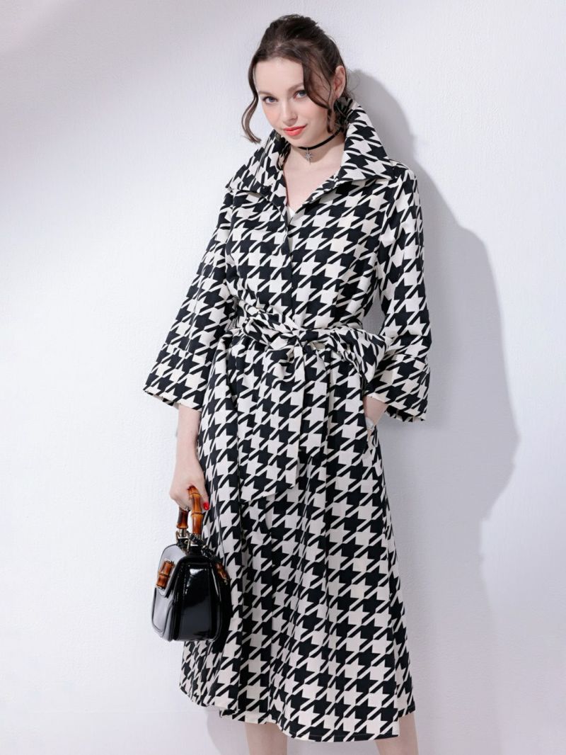 気分を盛り上げる千鳥格子柄のクラシカルなコートワンピース。