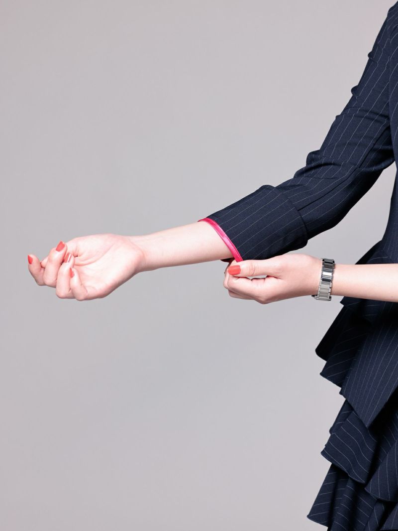 インナーに合わせたパープルのブラウスで、印象を一段と引き上げて。