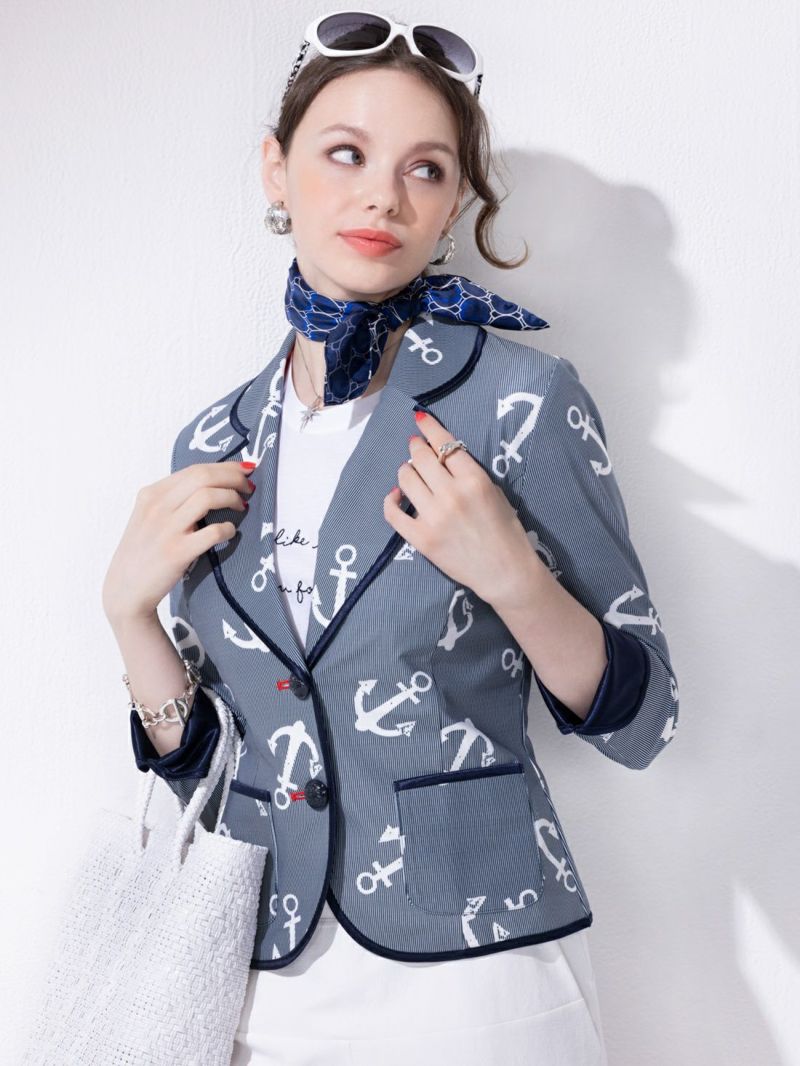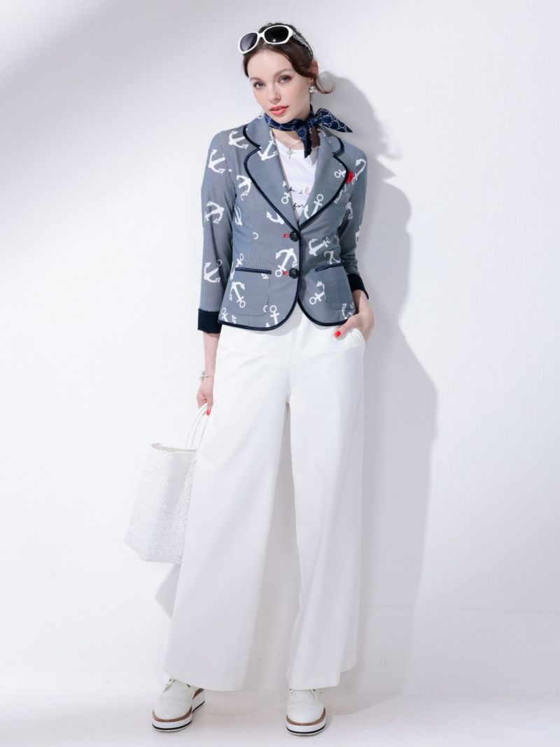 インナーやボトムにはホワイトアイテムを合わせ、ジャケットが際立つスタイリングに仕上げました。