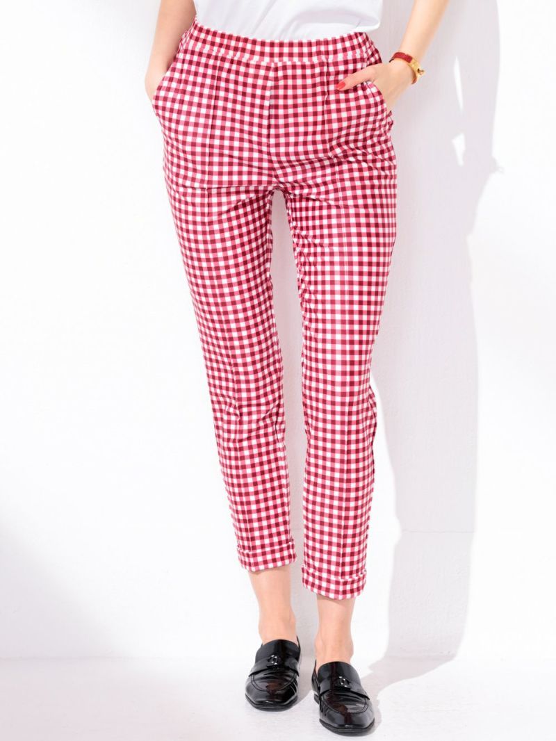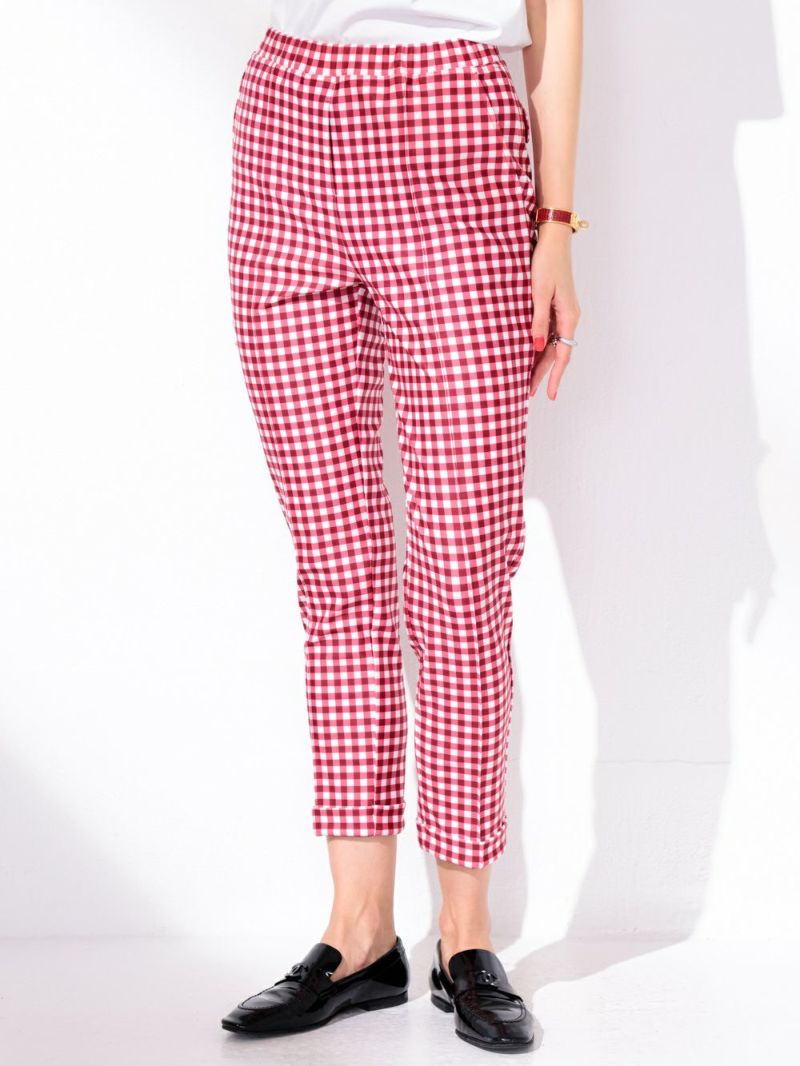 ピンクのギンガムチェックが春らしく軽やかなパンツスーツ。