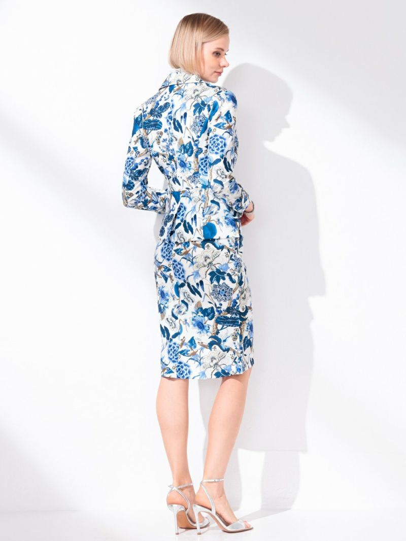 清涼感のあるブルーボタニカル柄のスカートスーツ。