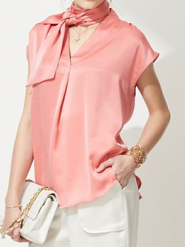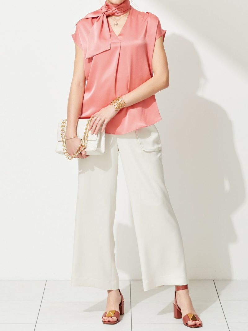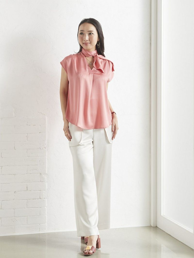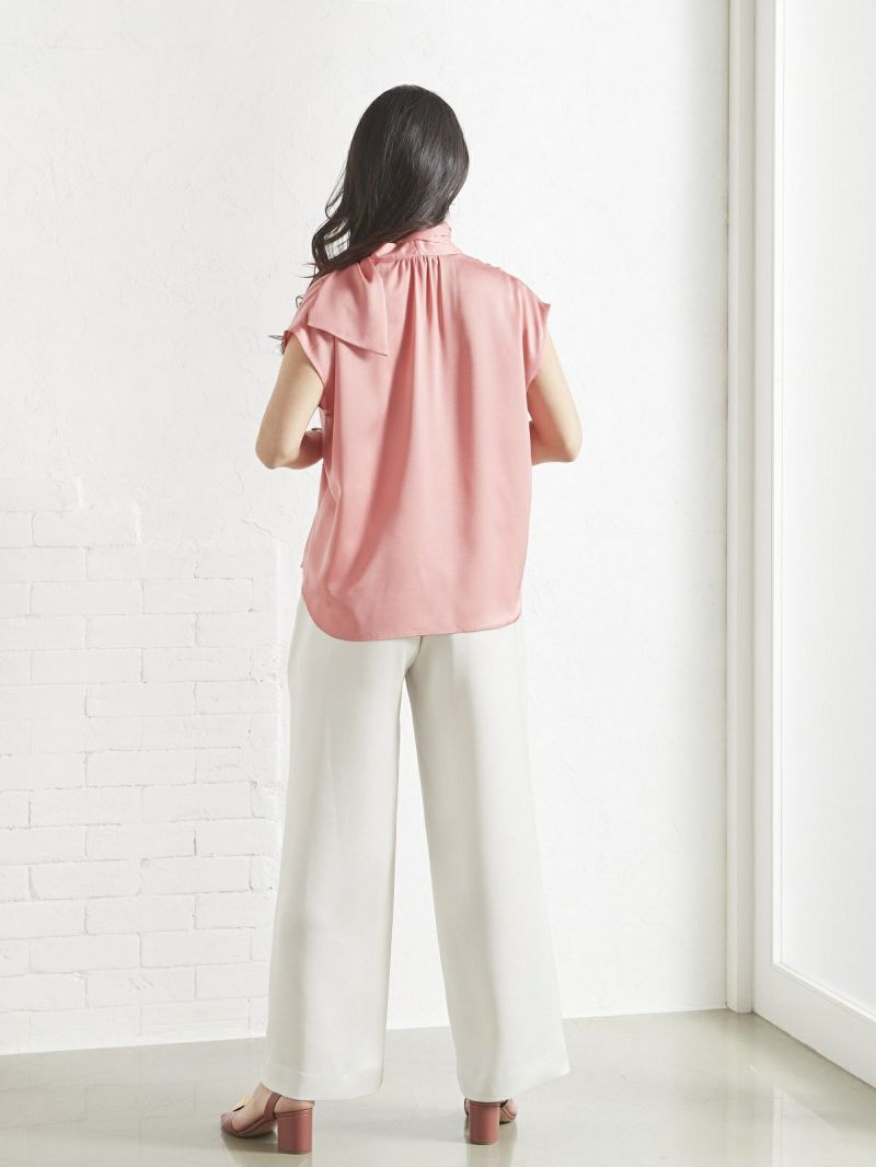 肌触りの良いサテン生地で仕立てた、プレーンなデザインのフレンチスリーブブラウス。