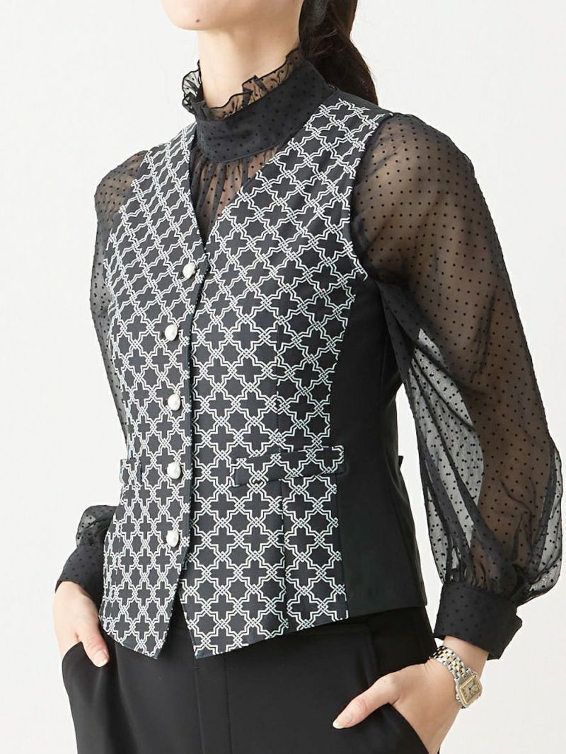 今季のテーマである幾何学柄プリントを使用したオリジナルベスト。