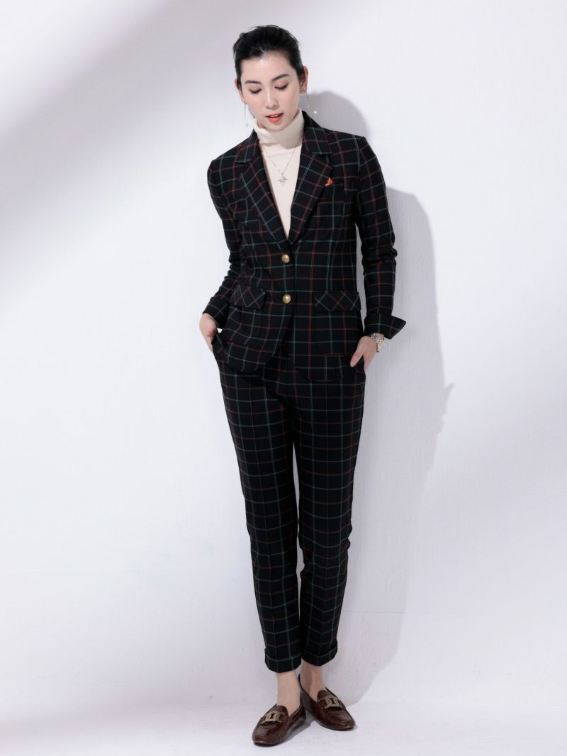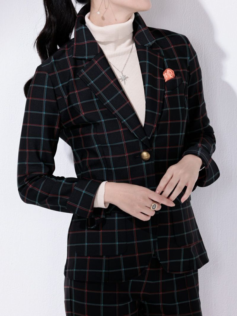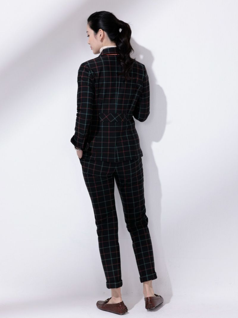 レッド×ブルーのチェックジャケットです。 伸縮性のあるストレッチ素材を使用し、