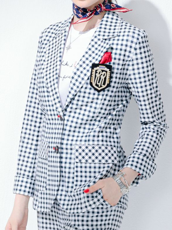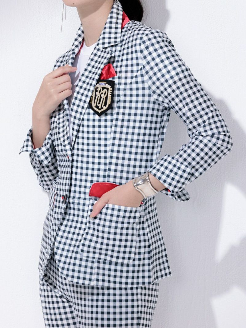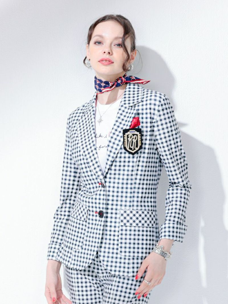 定番のギンガムチェックスーツが新たな魅力を加えて登場。