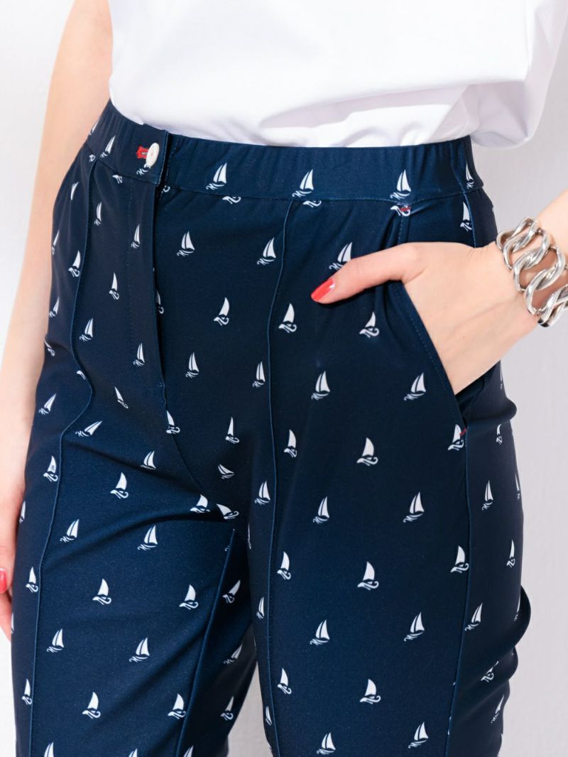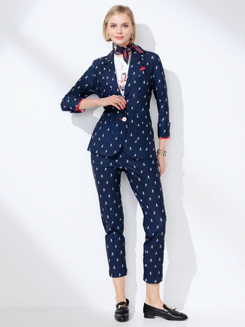 ヨット柄を一面にあしらった、ネイビーのパンツスーツ。