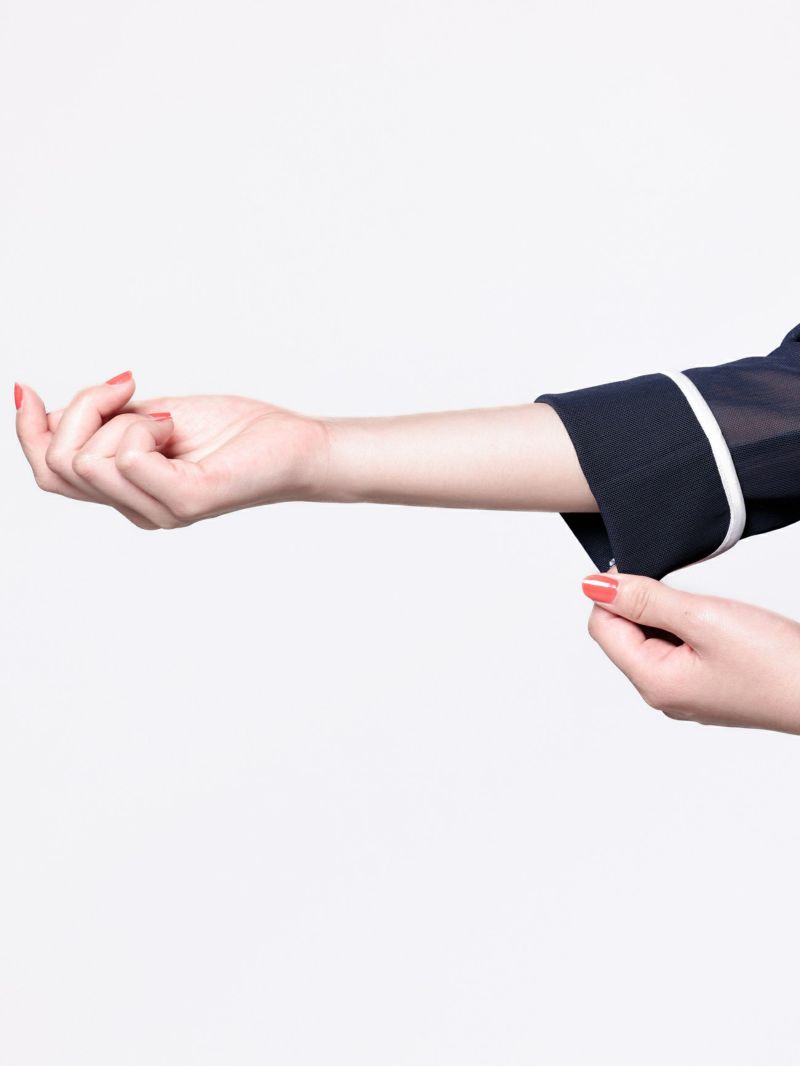 ネイビーに映えるホワイトパイピングが、顔まわりを明るく引き締めてくれます。