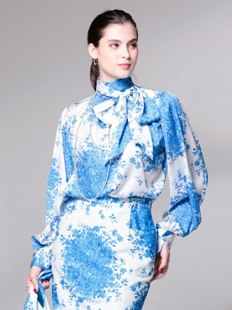 艶感のある素材に咲くブルーの花々が、華やかさと気品を添えます。