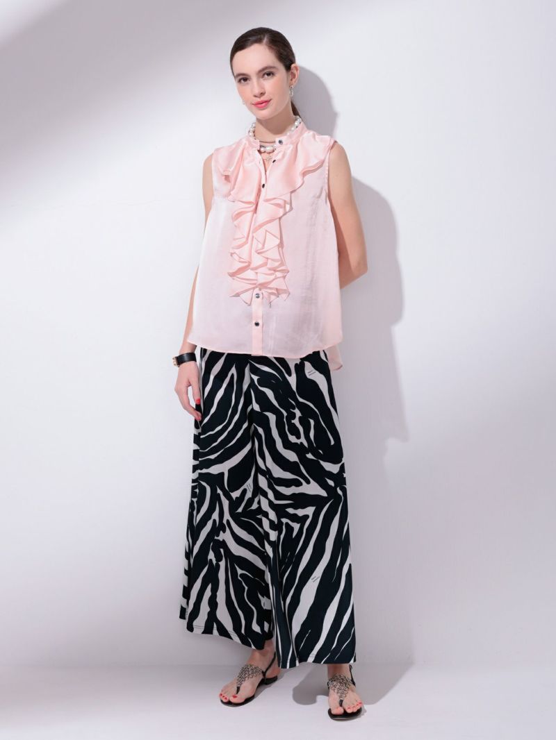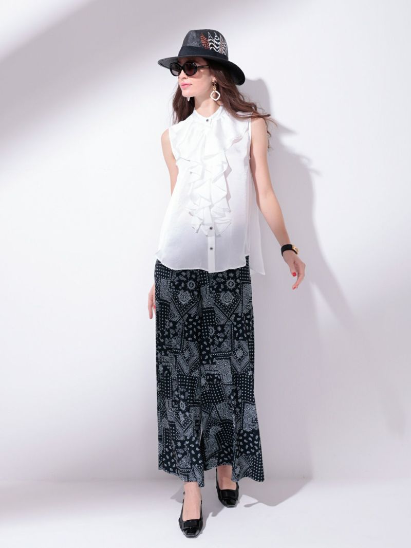 立体的なフリルが目を引く、華やかさと品の良さを兼ね備えたブラウス。