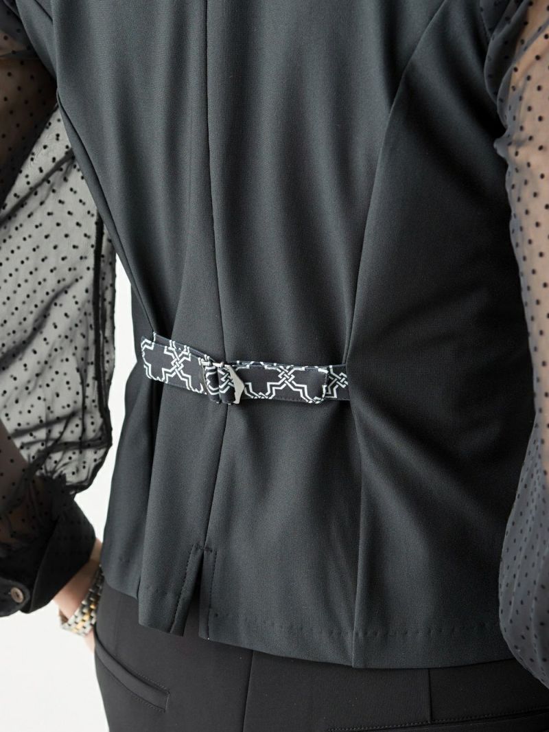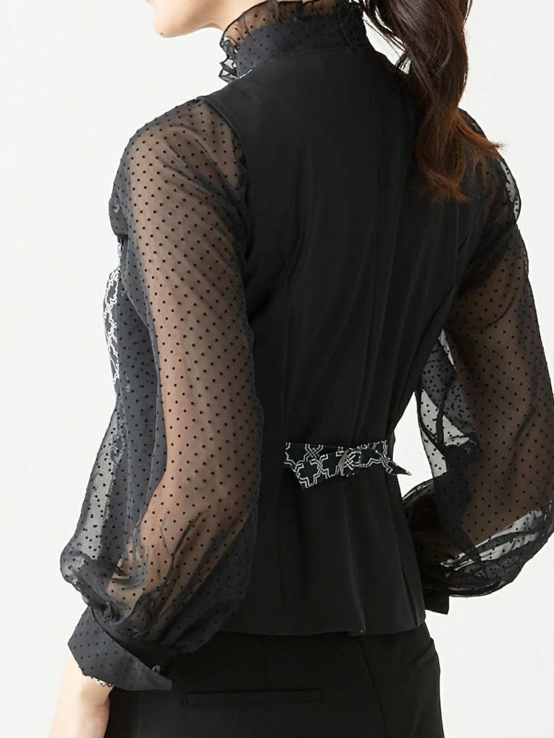 ジャケットのインナーとして、タートルネックニットやブラウスにレイヤードしたスタイルもオススメ。