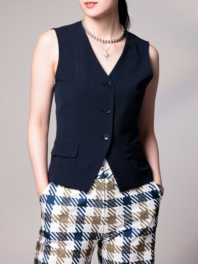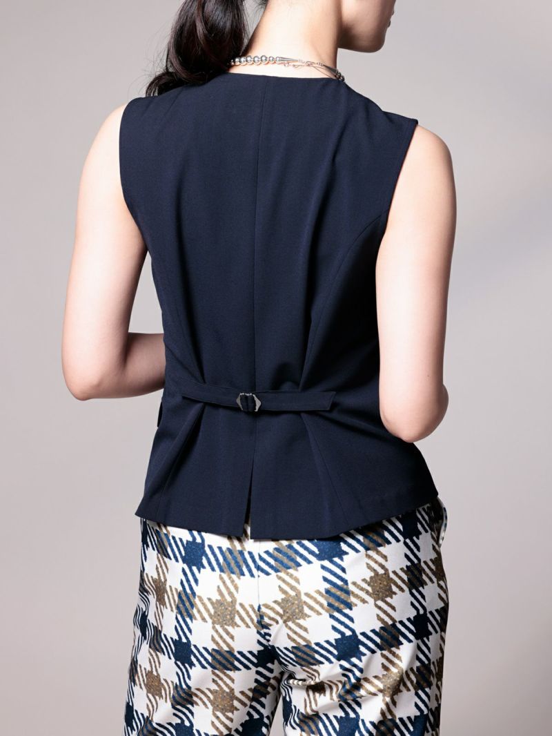 前後がストレッチ素材で着心地抜群のネイビーベスト。