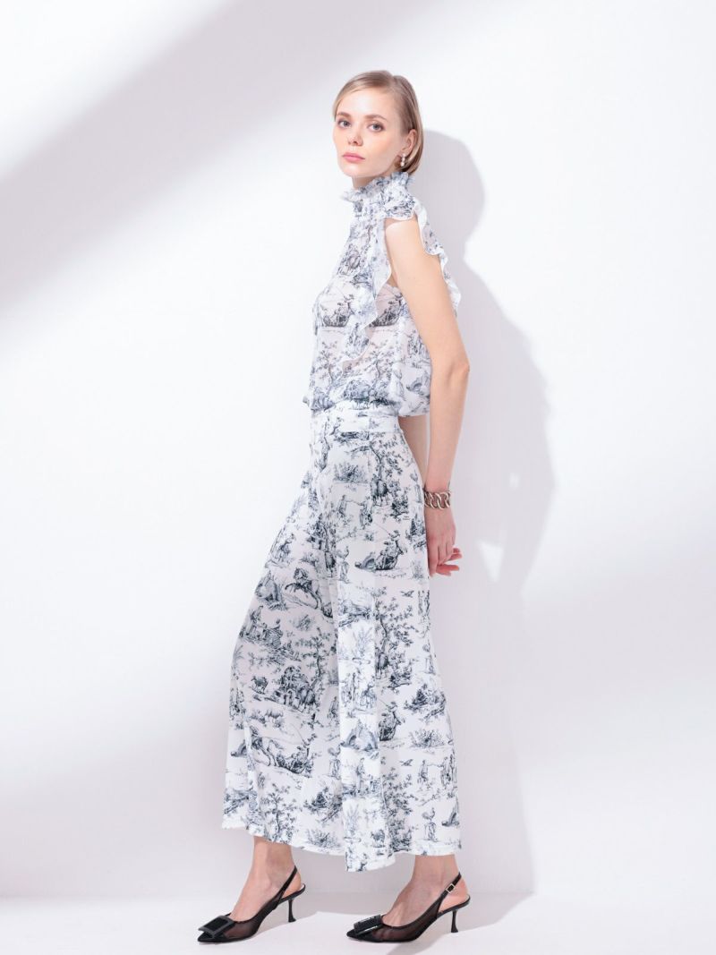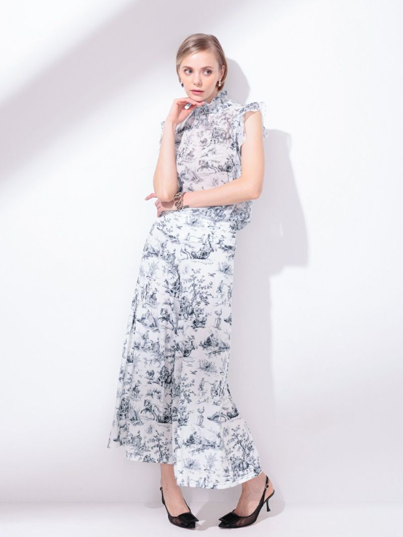クラシカルなトワルドジュイ柄を、軽やかなシアー素材で仕立てたノースリーブブラウス。
