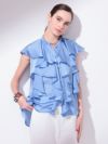立体的なフリルが目を引く、華やかさと品の良さを兼ね備えたサテンブラウス。