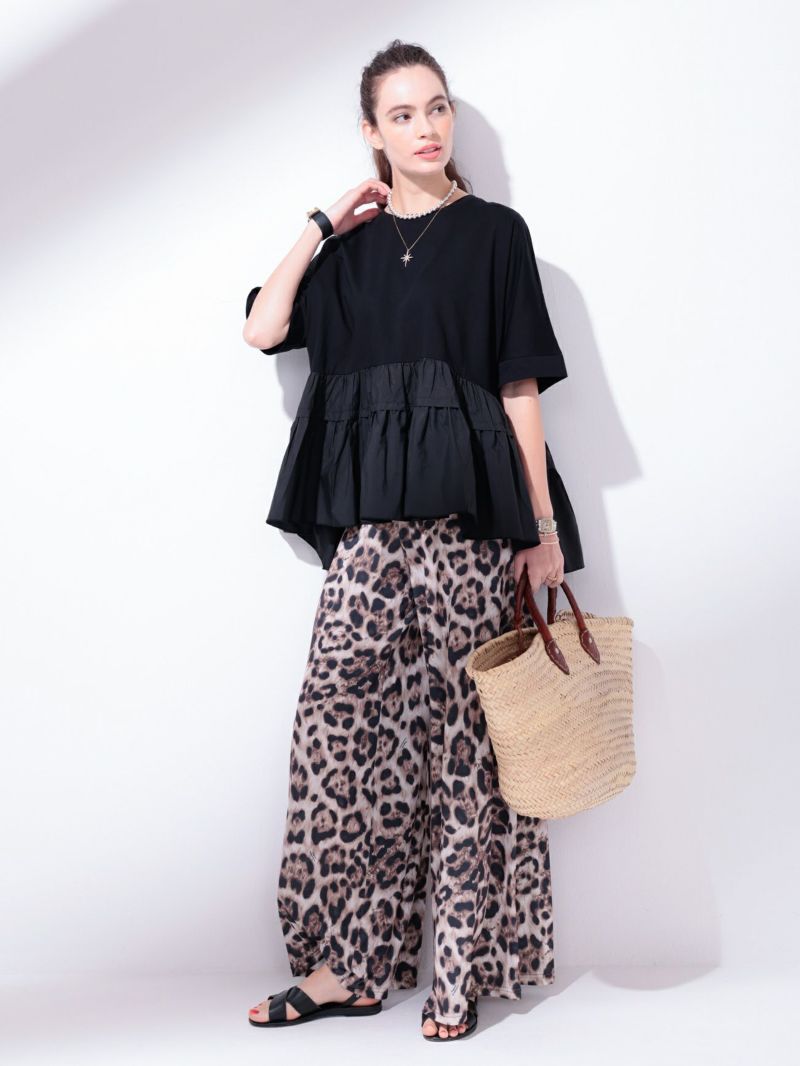 カットソー素材のトップと布帛の切り替えが生む、立体的でやわらかな表情が魅力です。