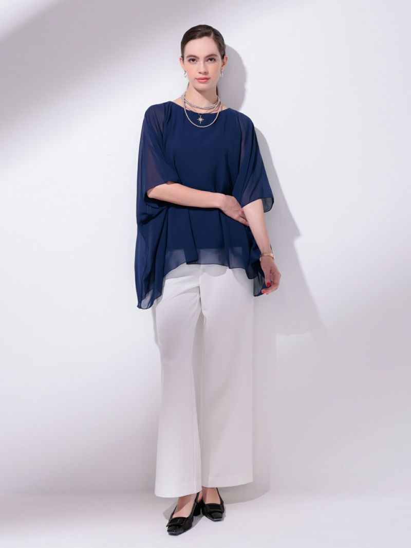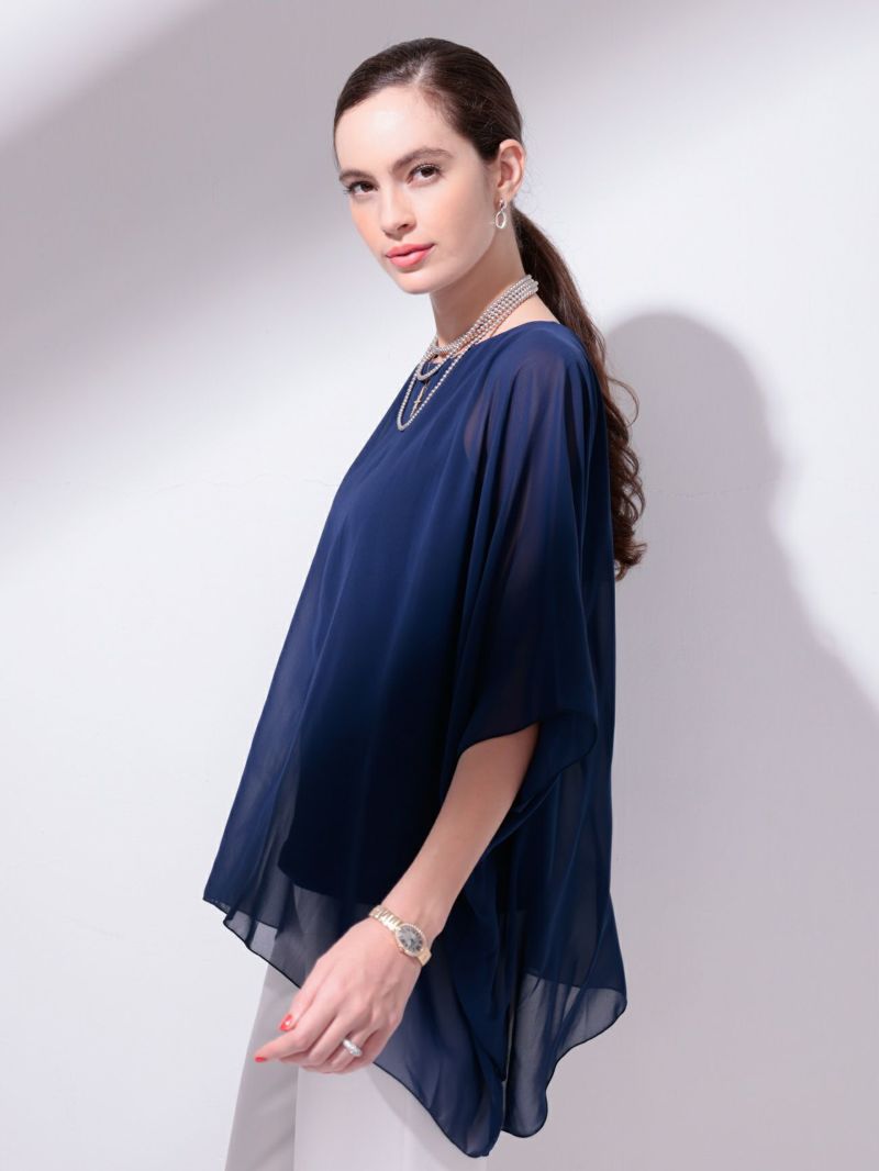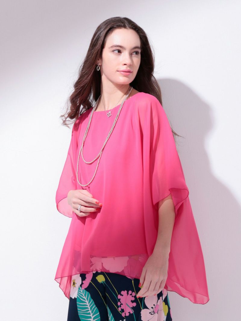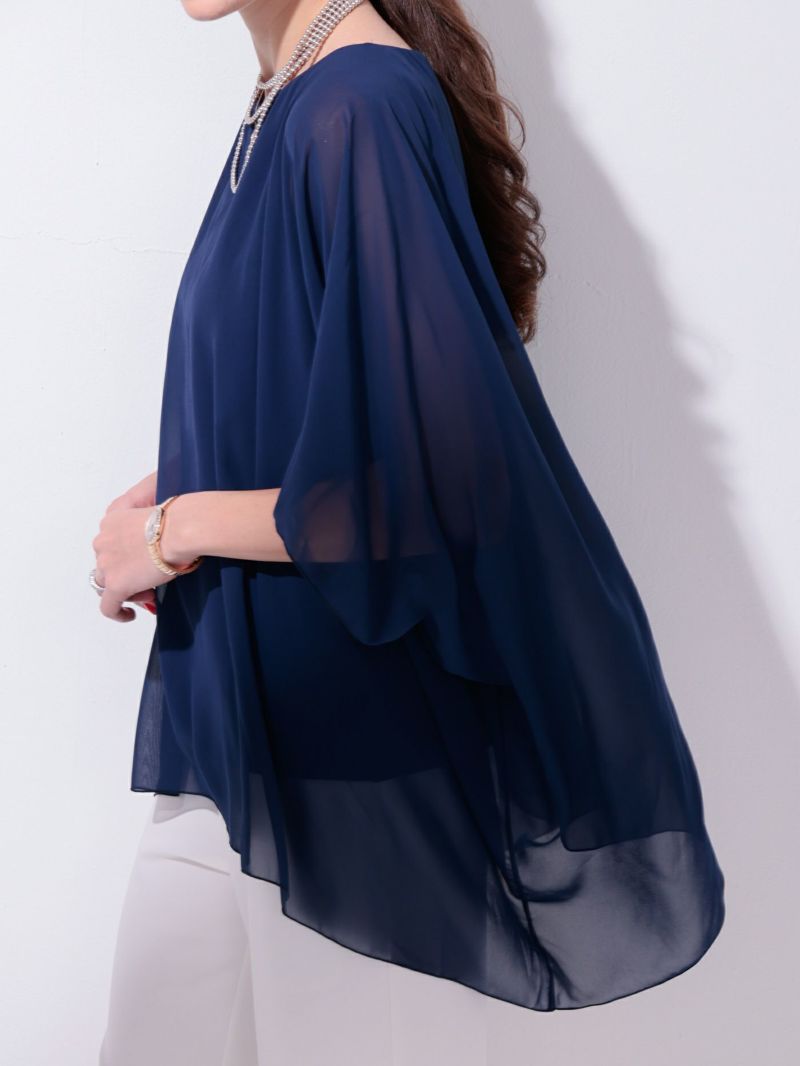 軽やかな透け感と、美しいドレープが魅力のシフォンチュニック。