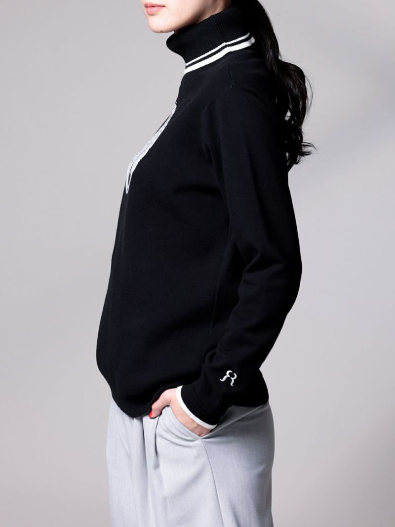 タートルネックの端正なラインに、首元のダブルラインがアクセント。