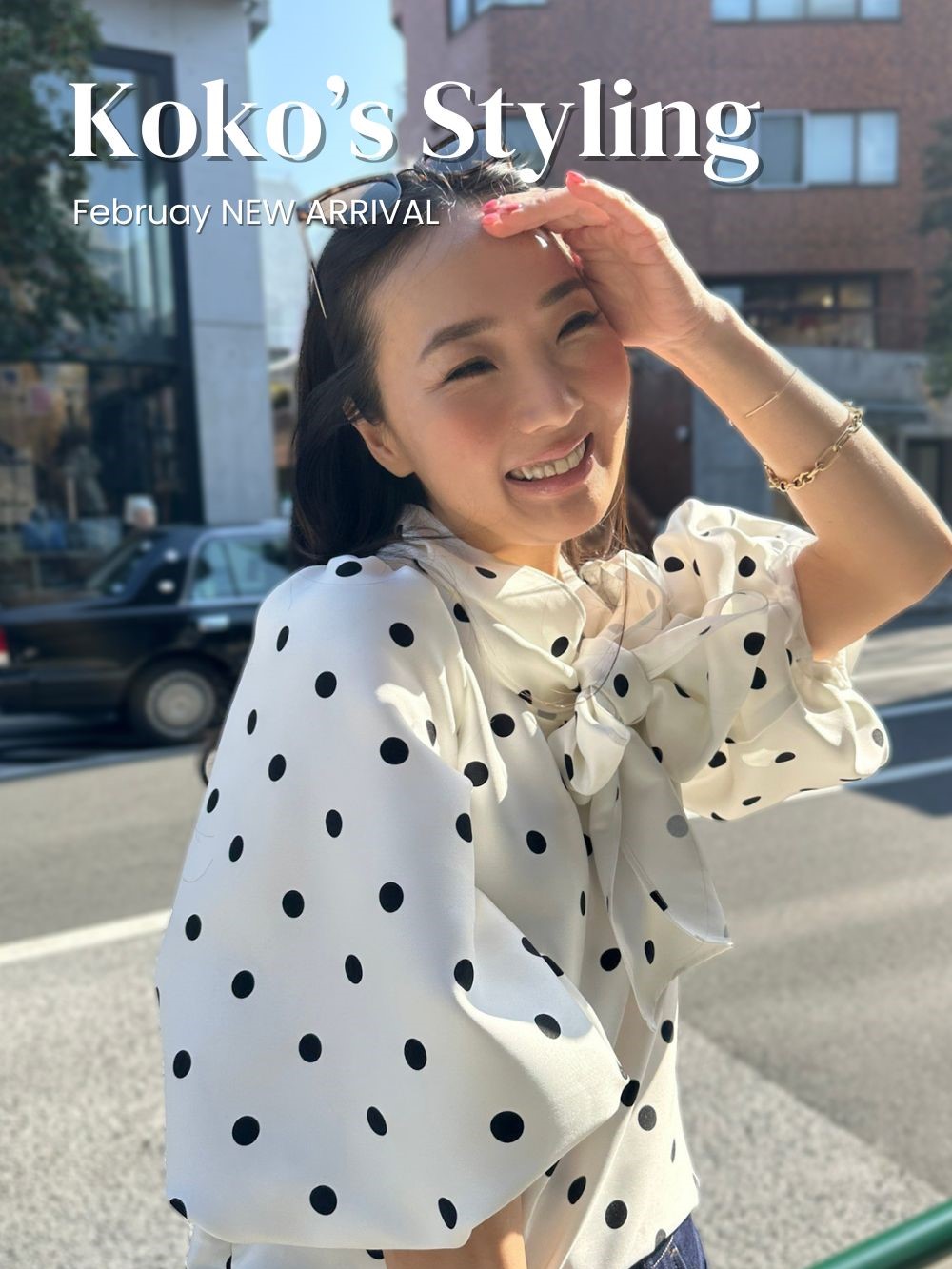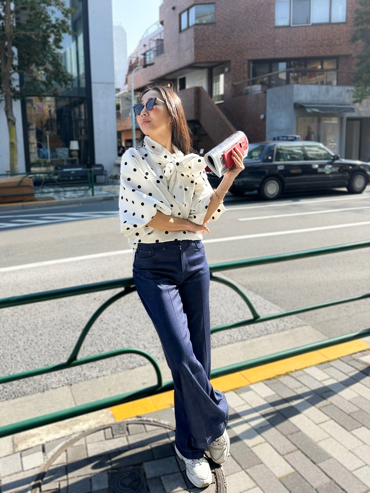 クラシックなドットブラウスにワイドデニムを合わせ、