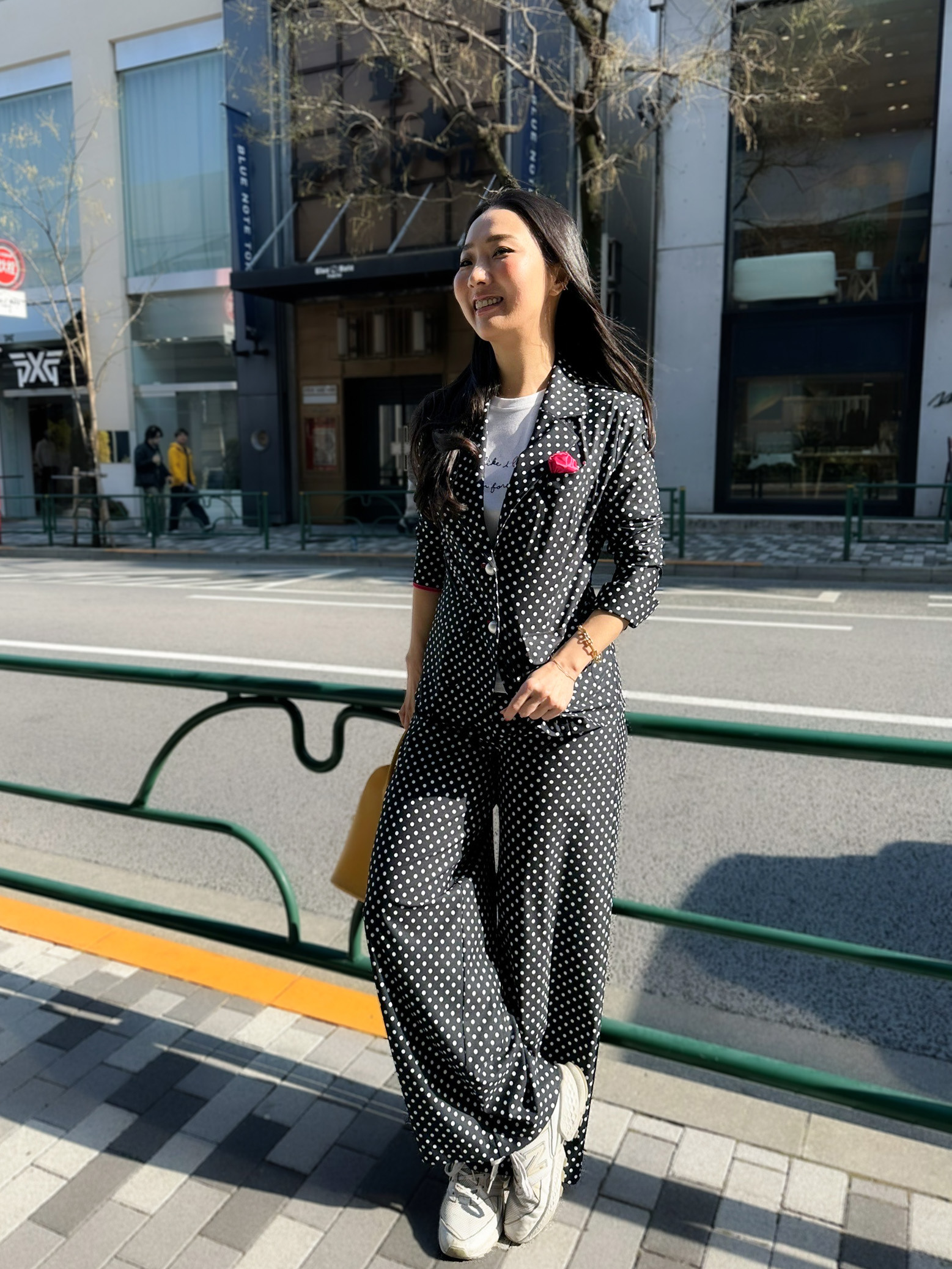 軽やかに魅せる、ドットスーツスタイル