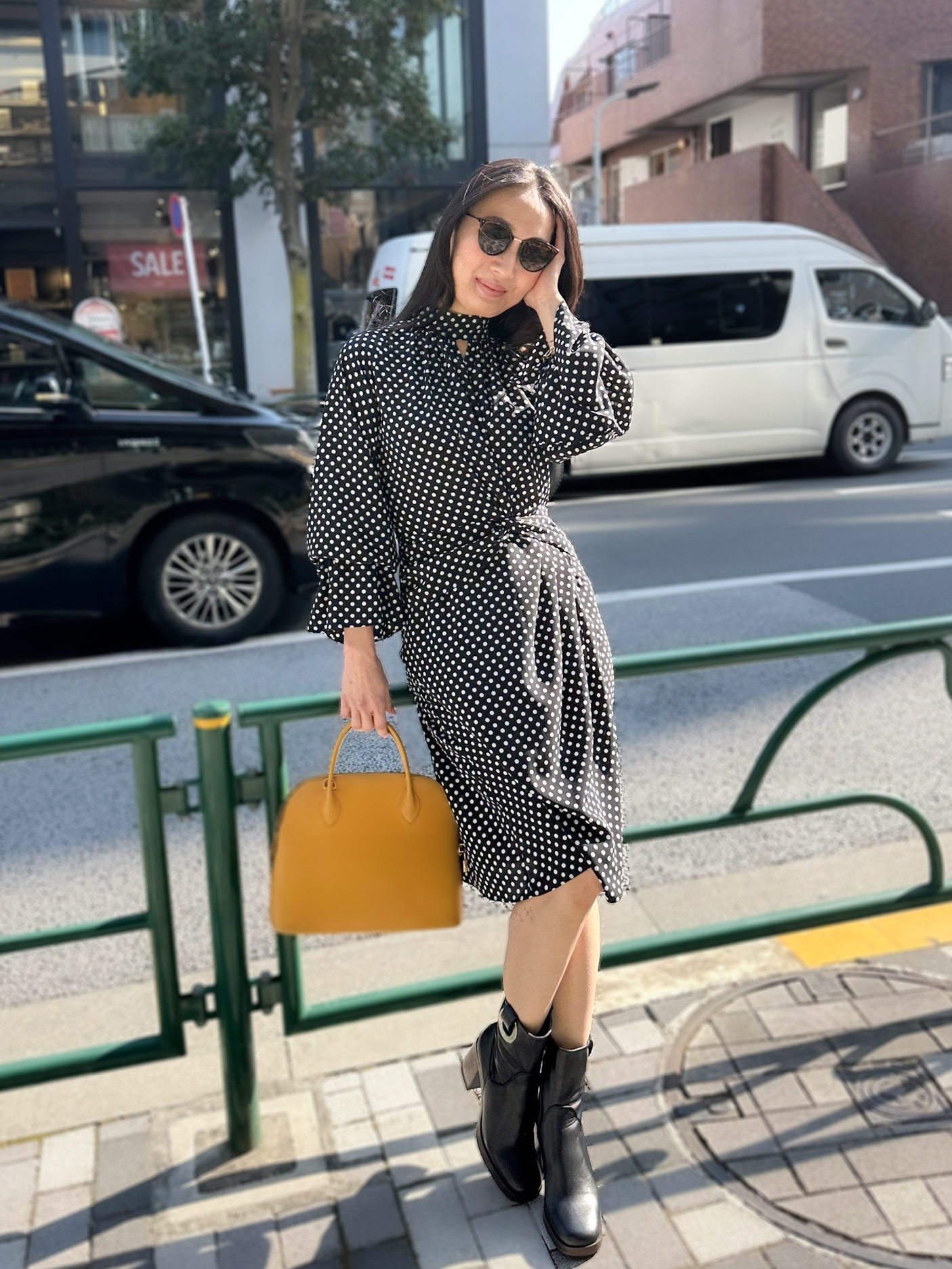 キャメルカラーのバッグを加えて柔らかなアクセントを添えました。