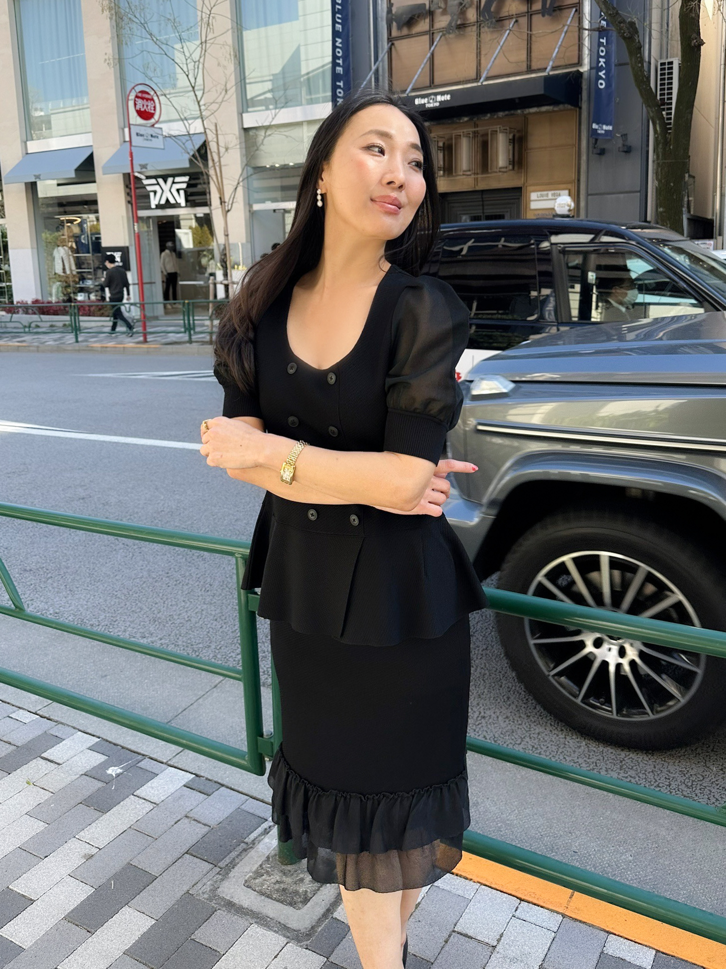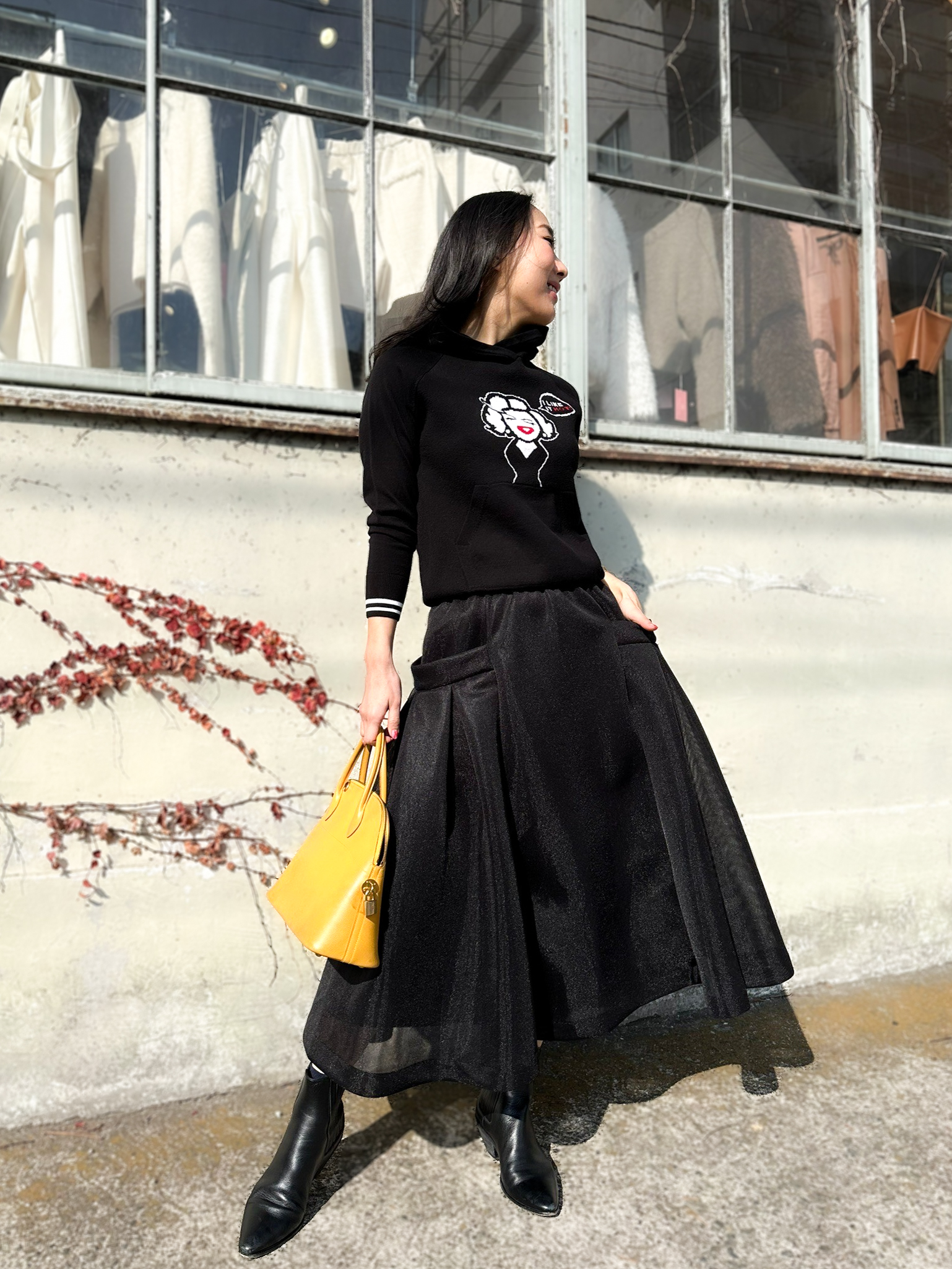 オールブラックコーデに、軽やかなシルエットと遊び心のあるディテールをプラス。