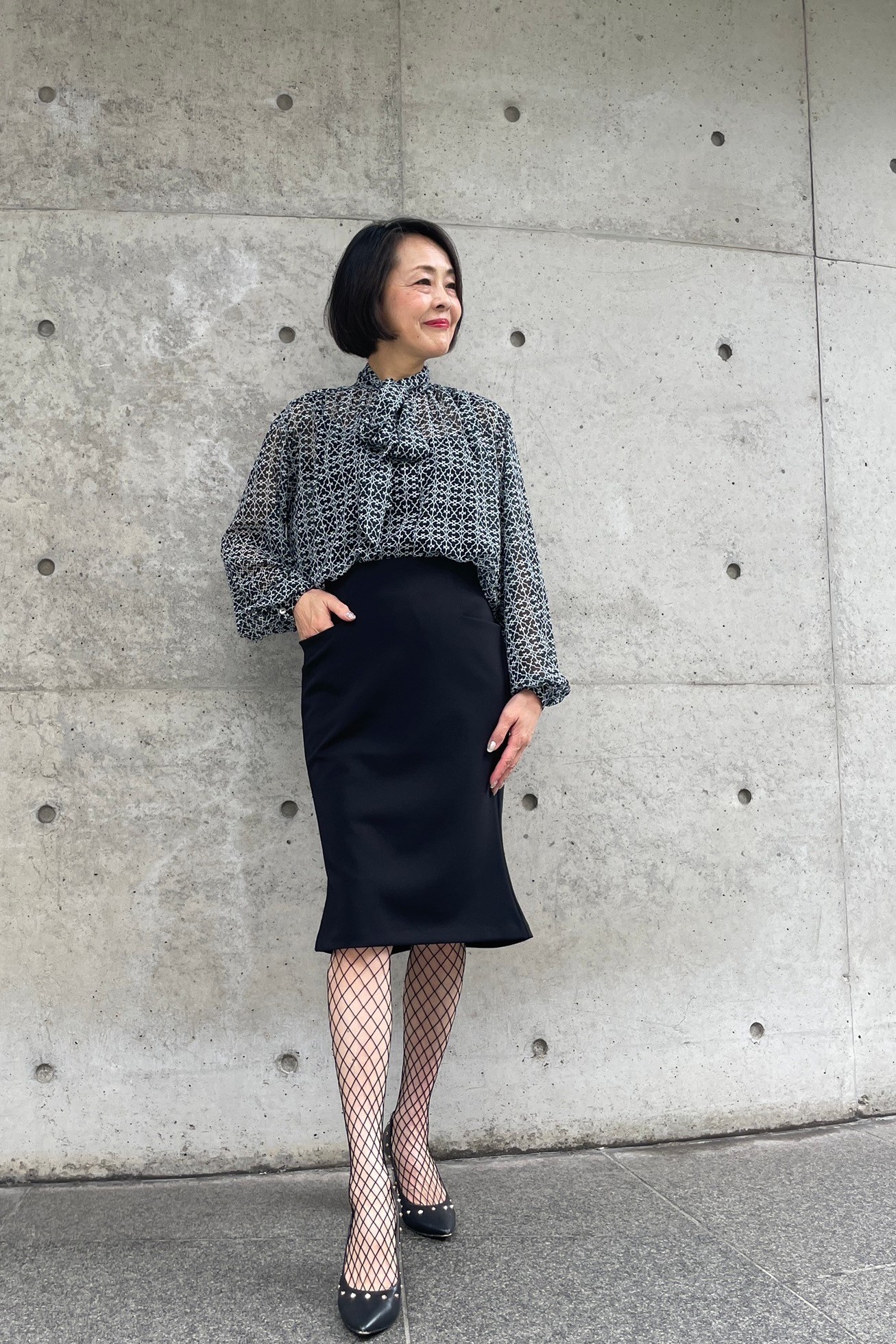 ブラウスのシャープな柄がコーディネートに個性をプラスし、