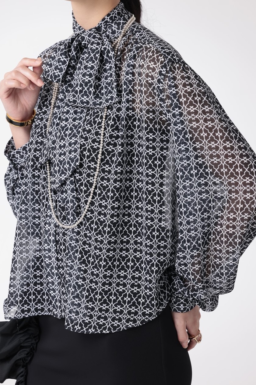 視線を引きつける幾何学柄のブラウスと、