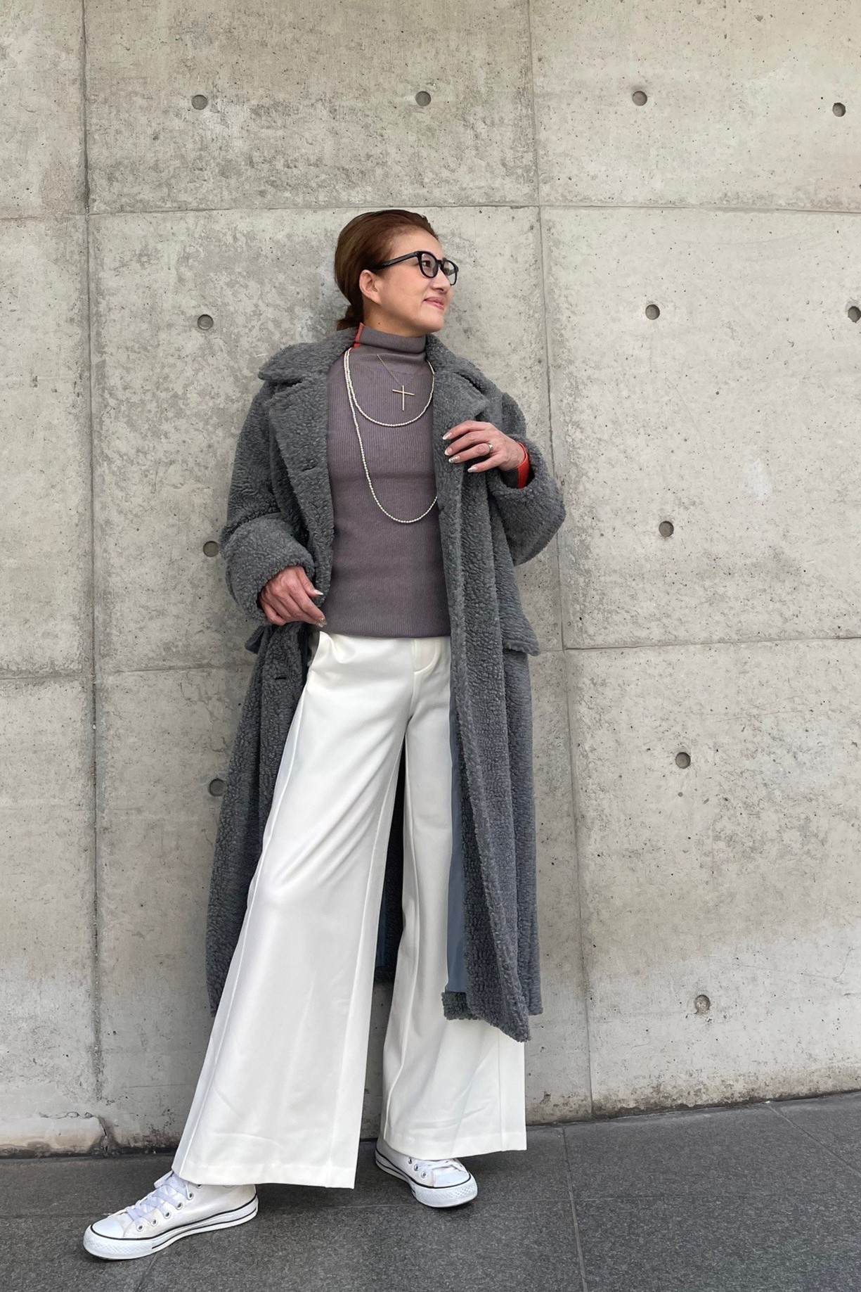 たっぷりとしたボリューム感が魅力のボアコートとホワイトパンツ。