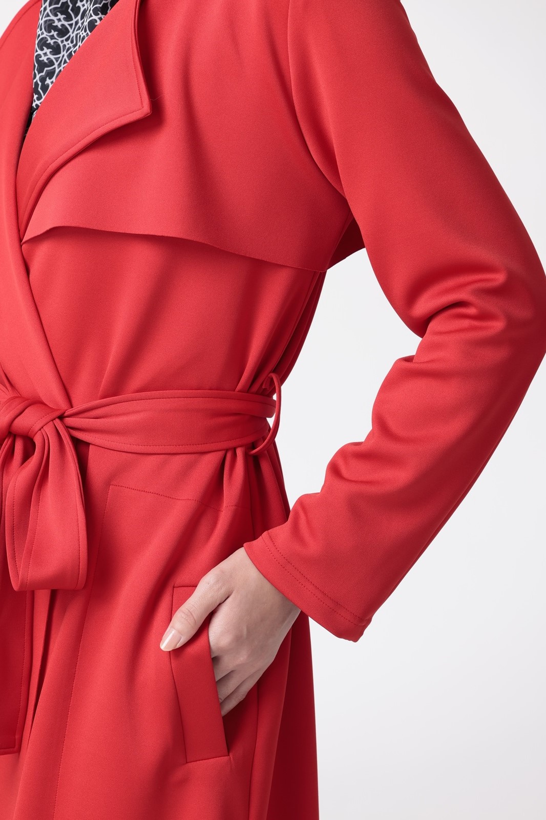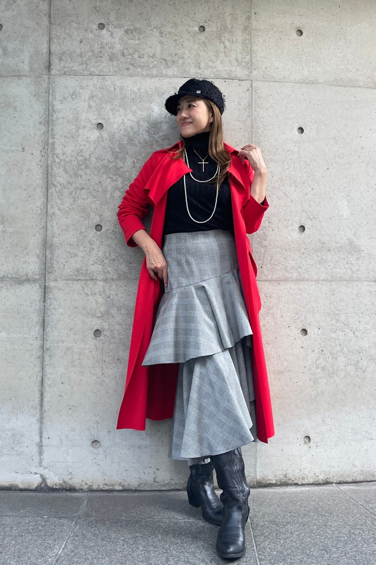 主役級のレッドトレンチコートで華やかさをまとい、