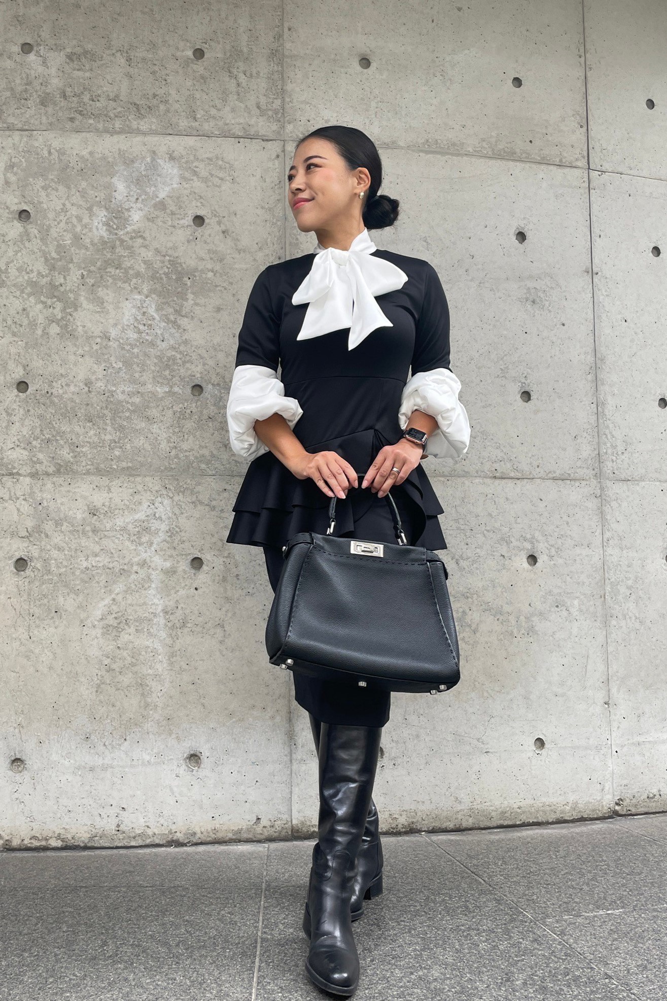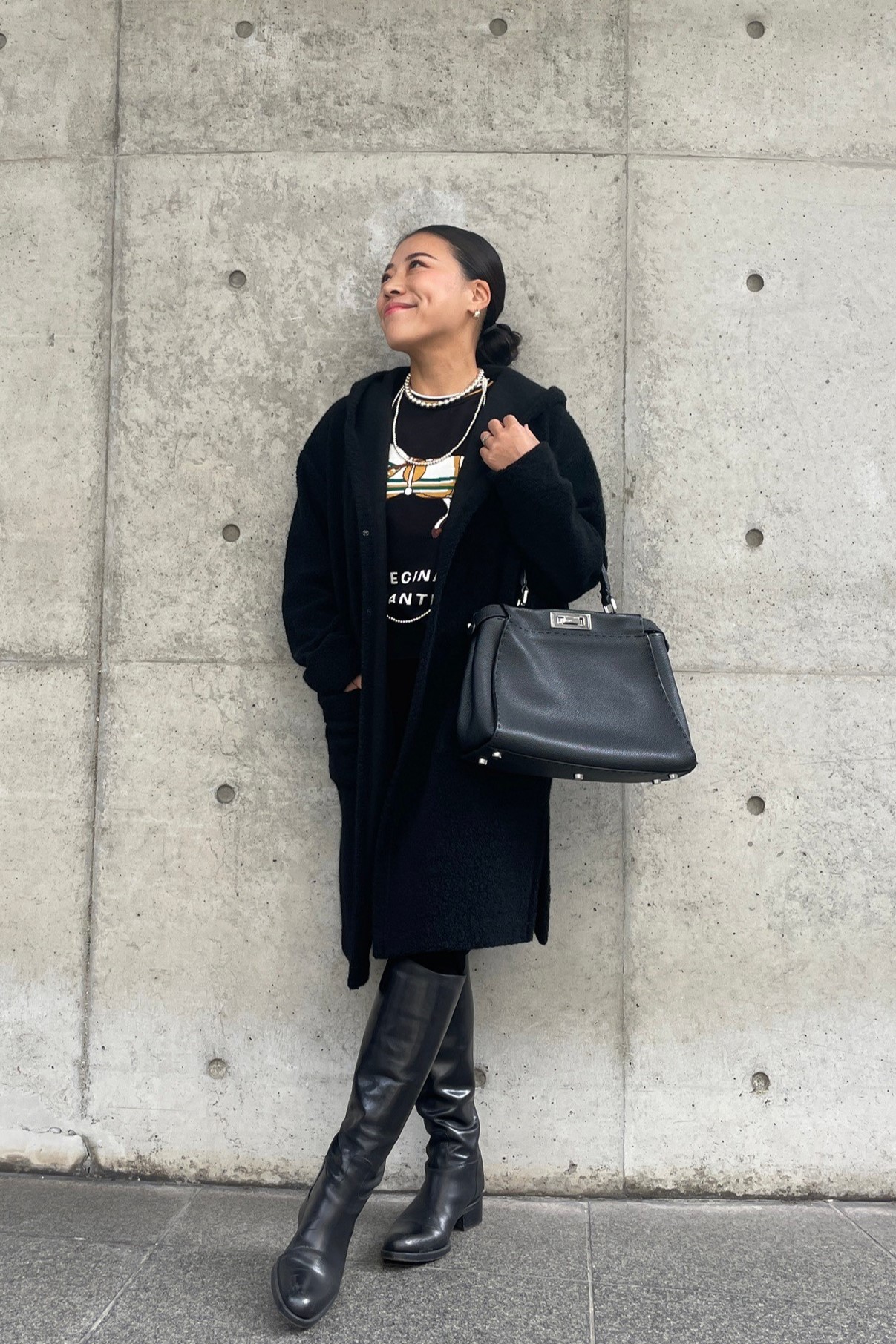 ふくらみのあるコーディガンとホースニット、ロングブーツを組み合わせたスタイリング。
