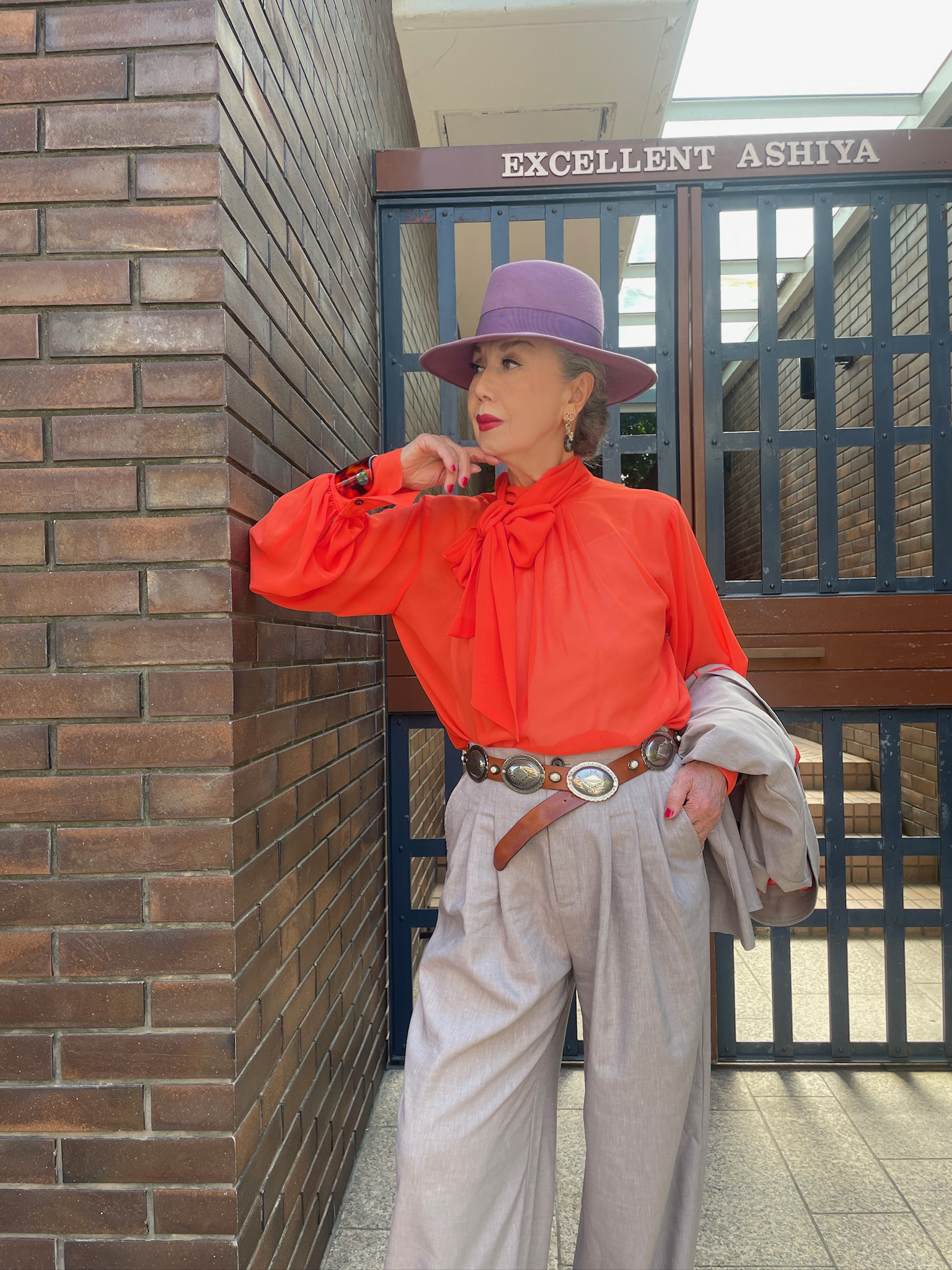 "PRAISE GOD"リネンスーツ×オレンジブラウス