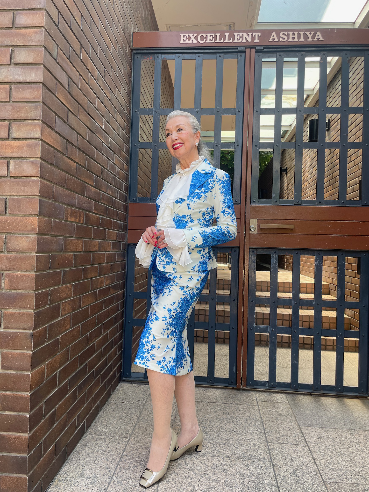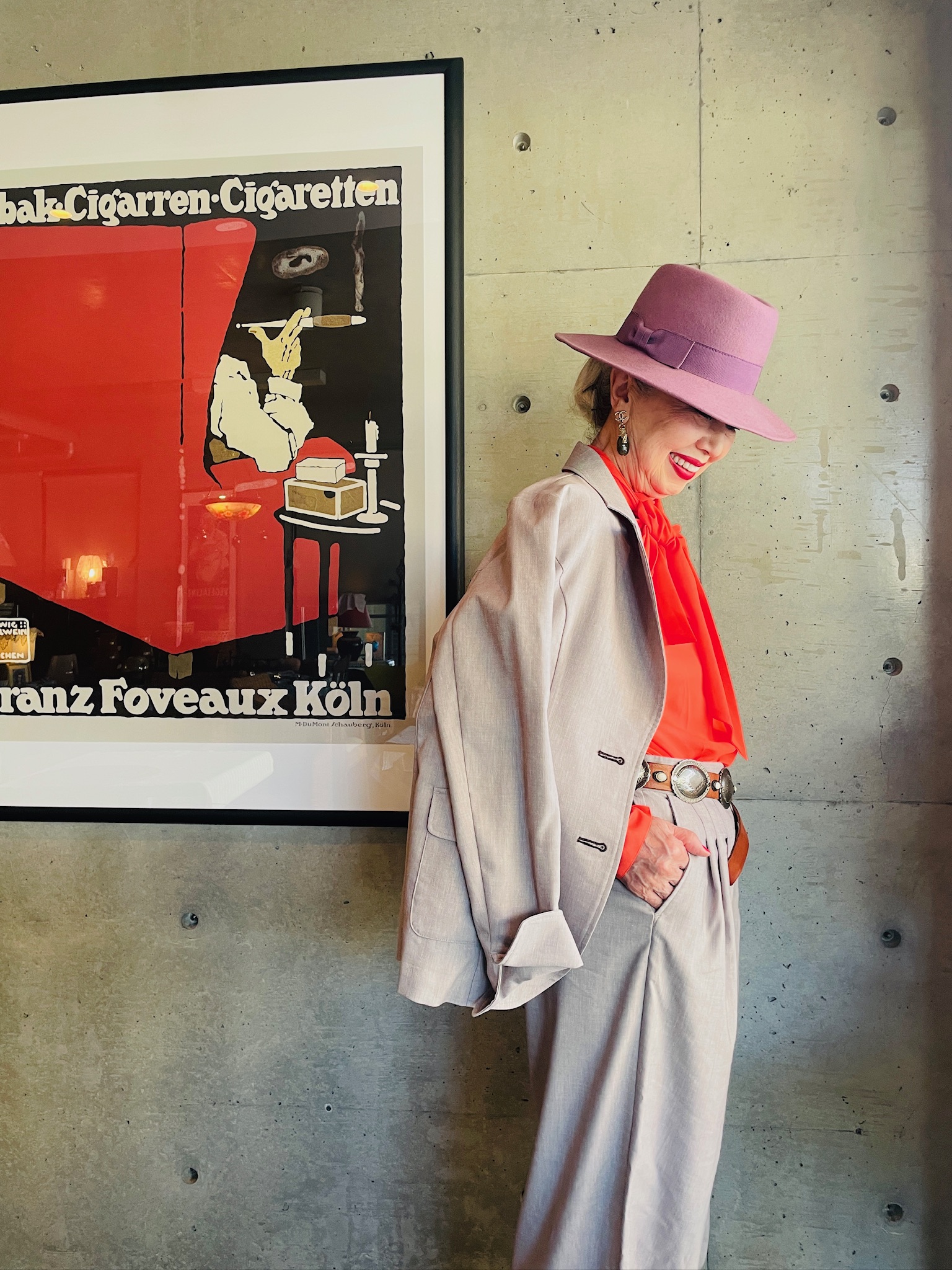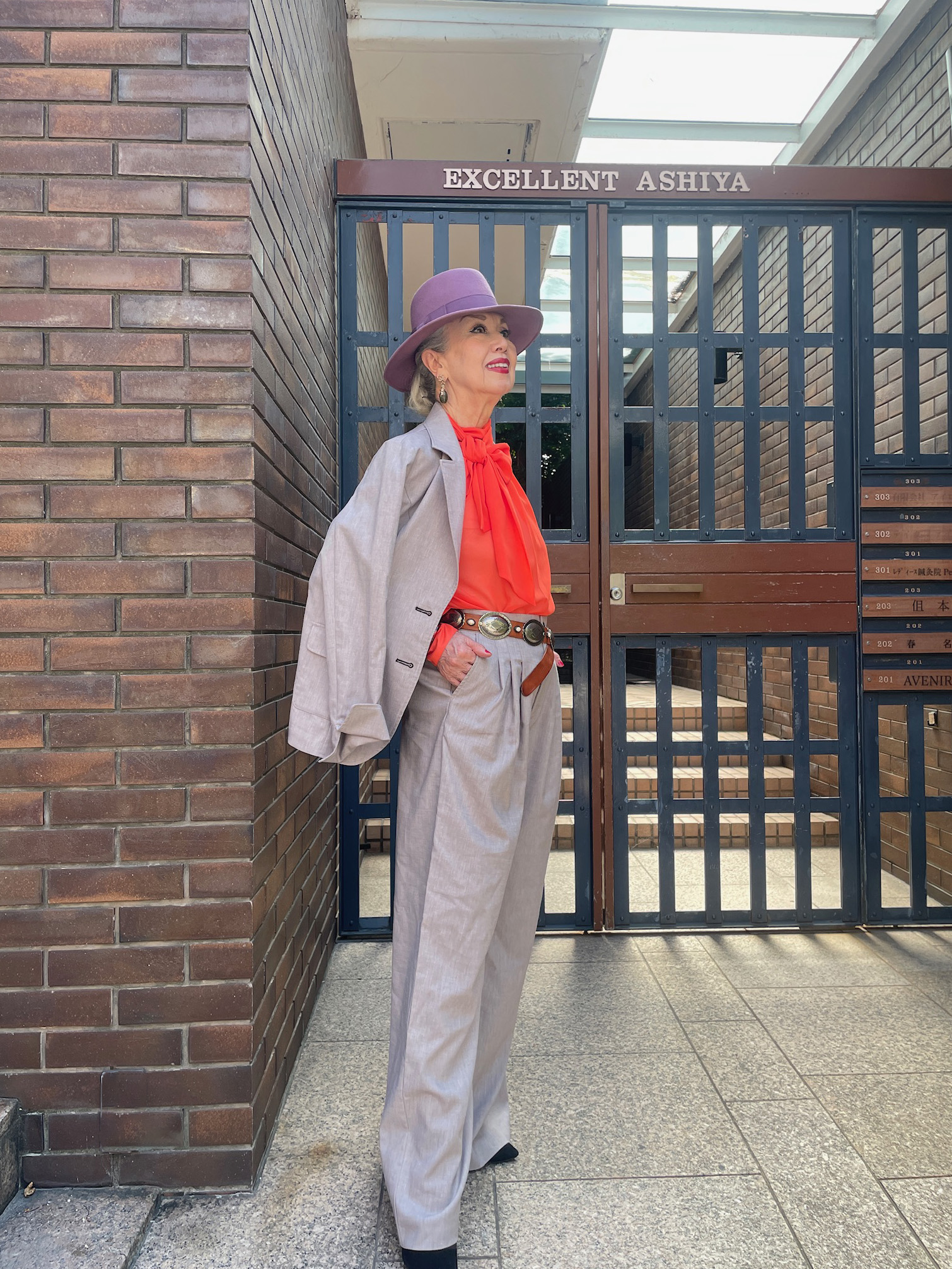 淡いリネンのスーツに、鮮やかなオレンジブラウスを加えて。