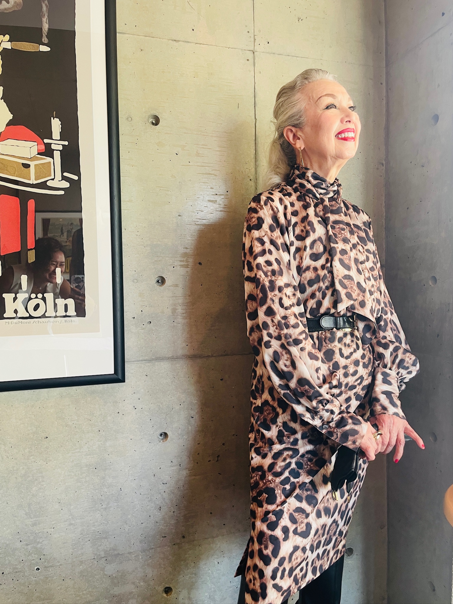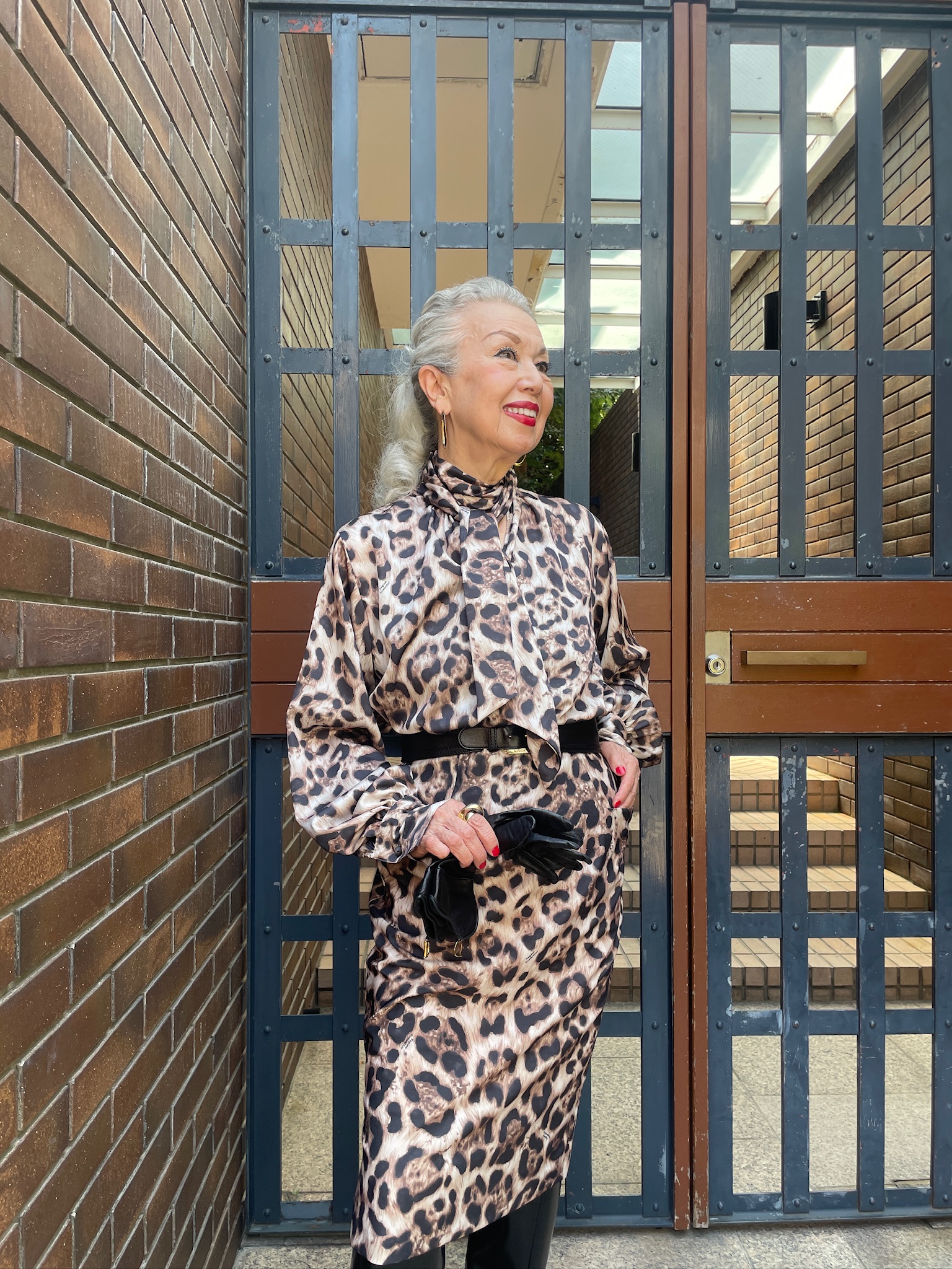 艶やかなレオパードに、黒のグローブとベルトが引き締めを添える。