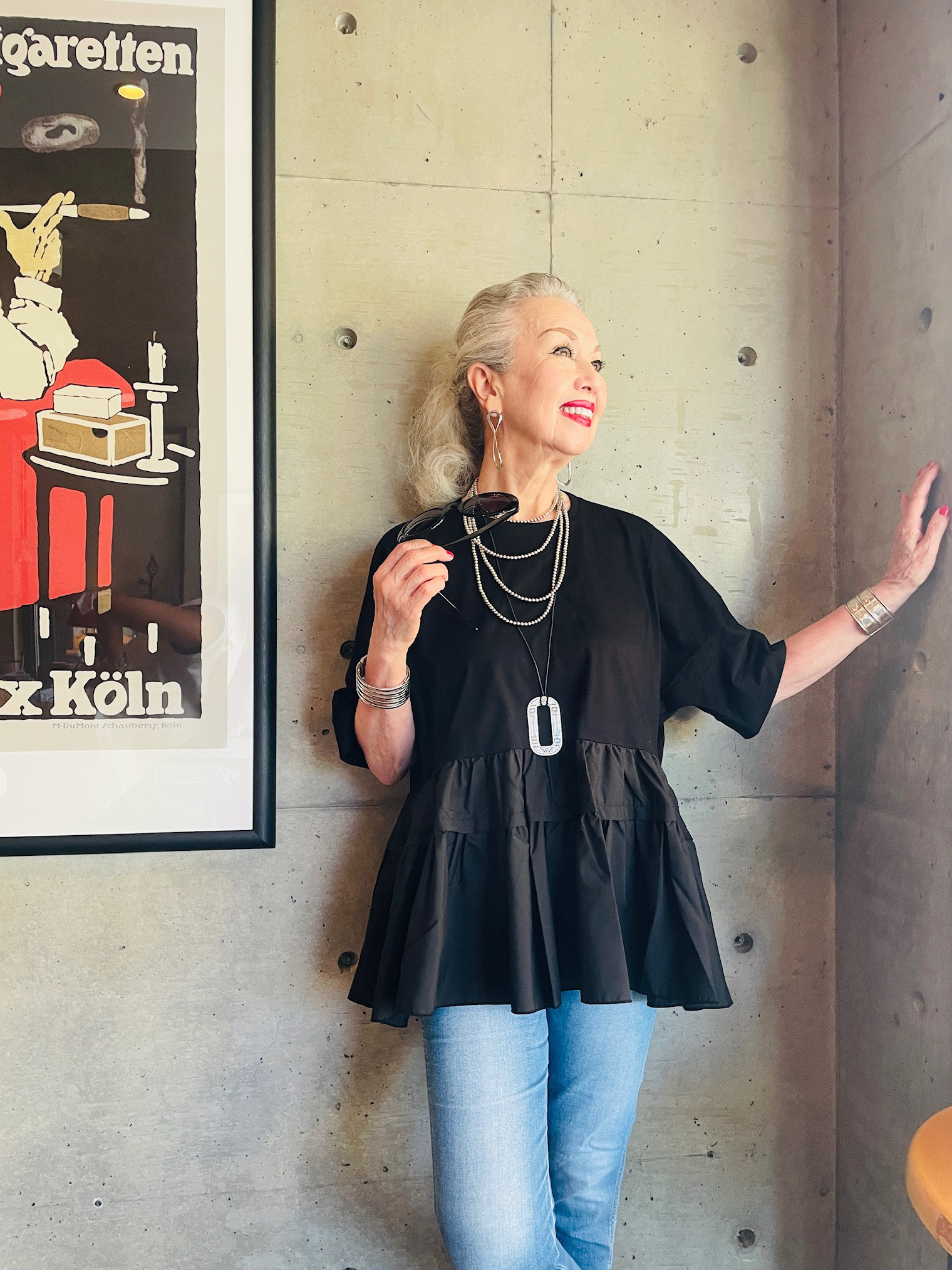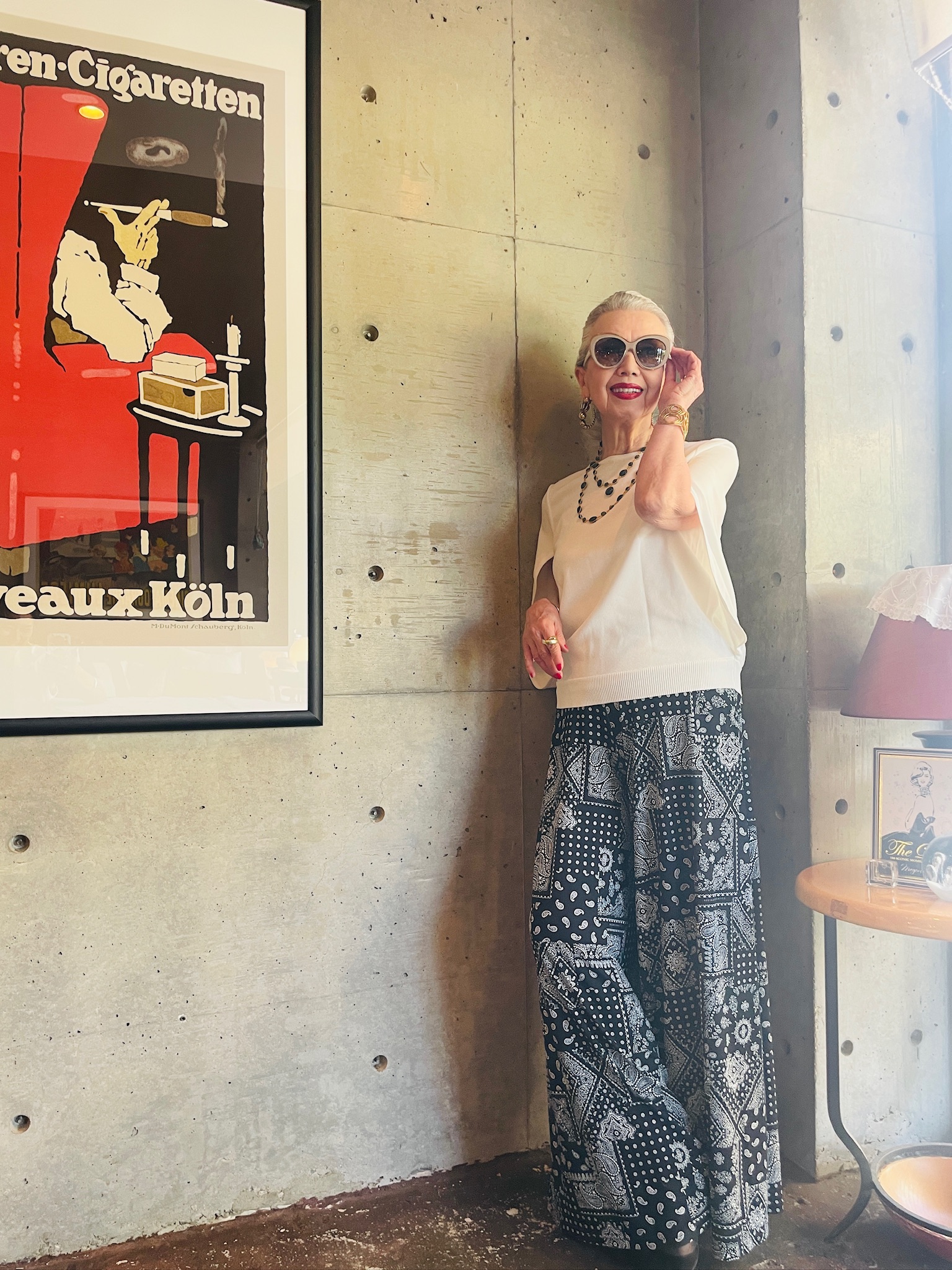 力を抜いた休日の装いにも、自然な華やかさが香るコーディネート。