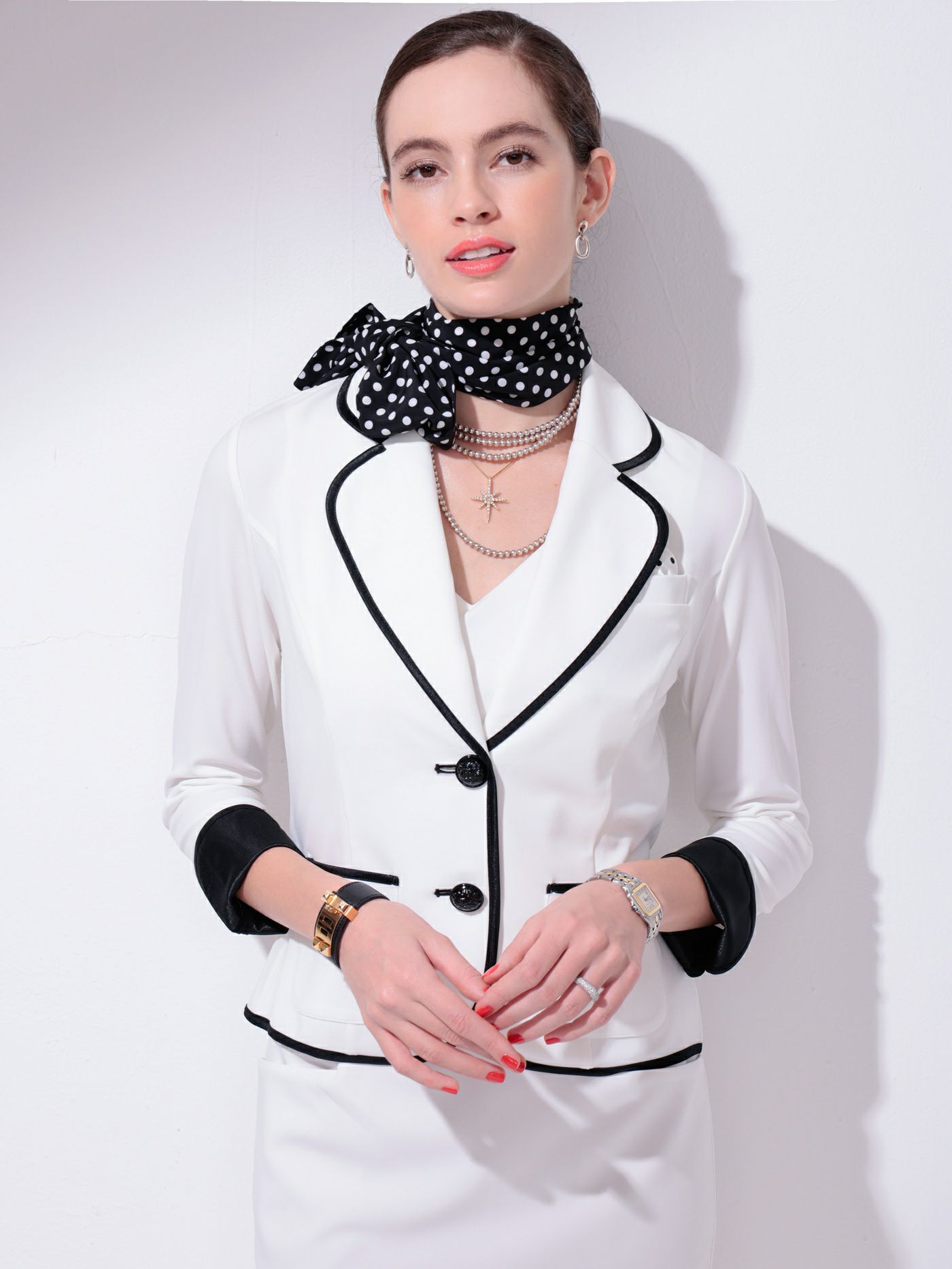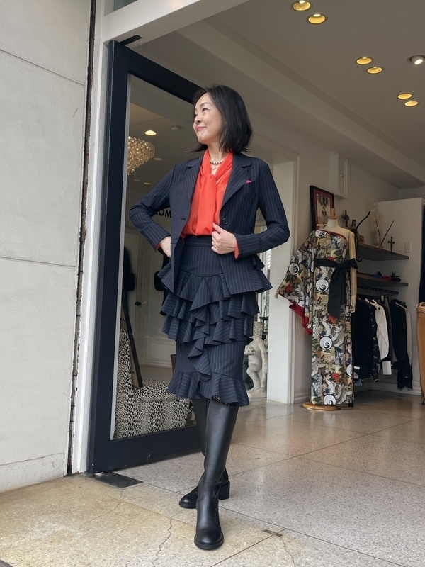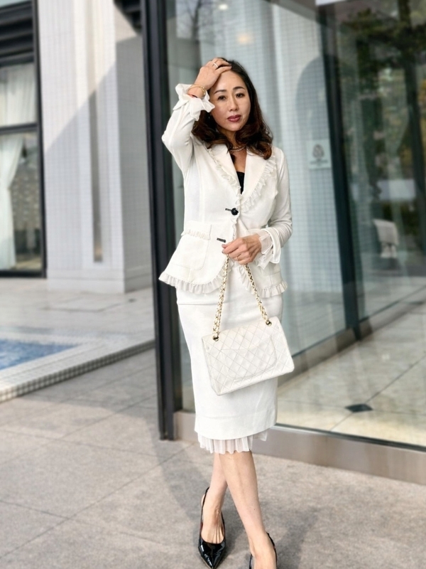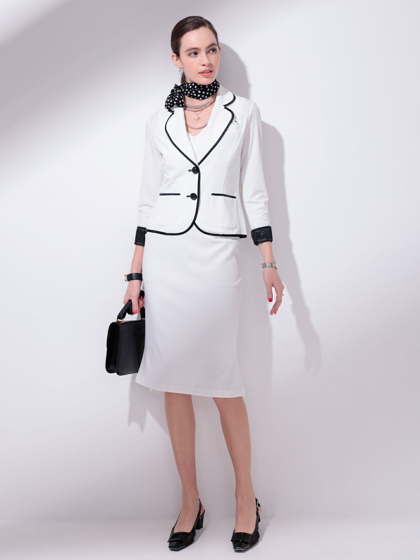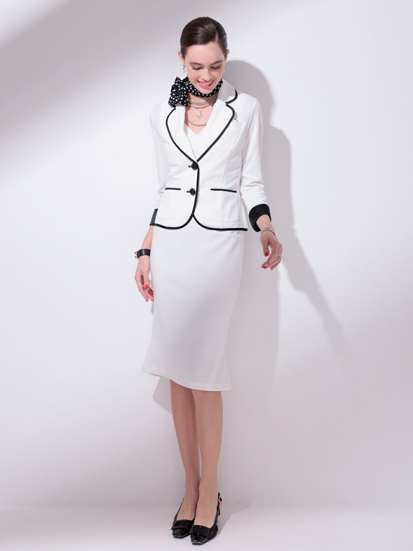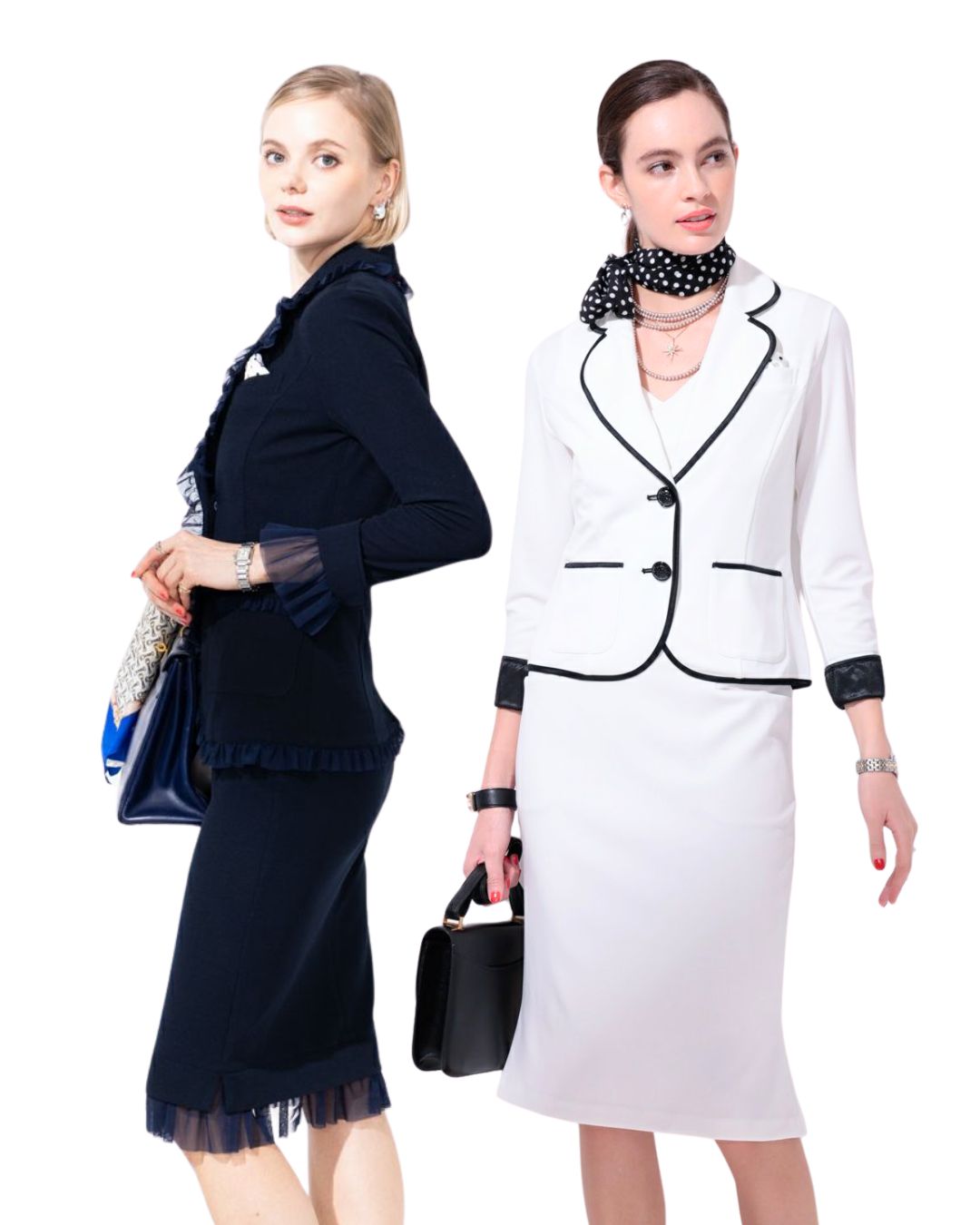 王道のきちんと感に、女性らしさを添えるスカートスーツ。