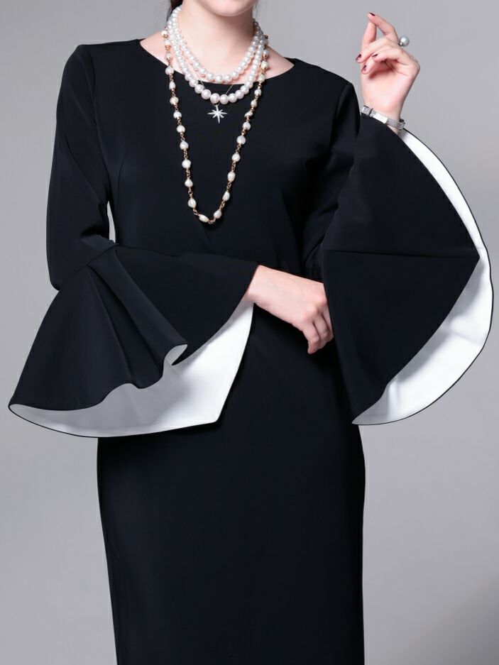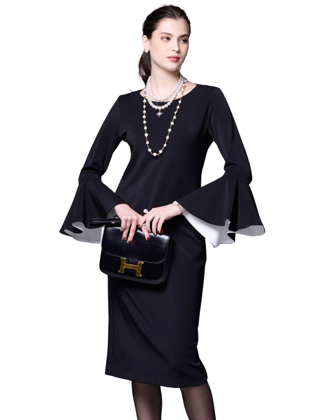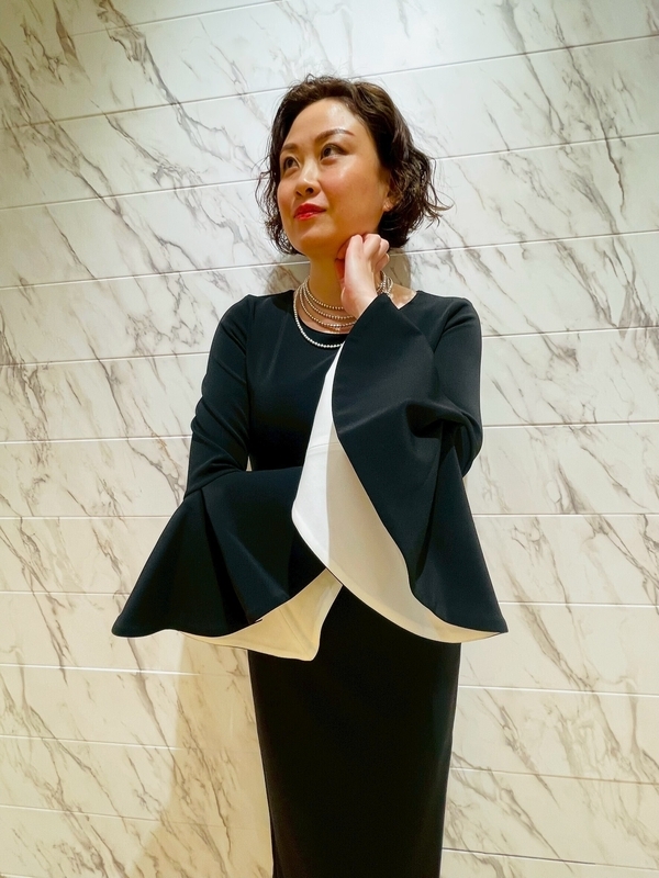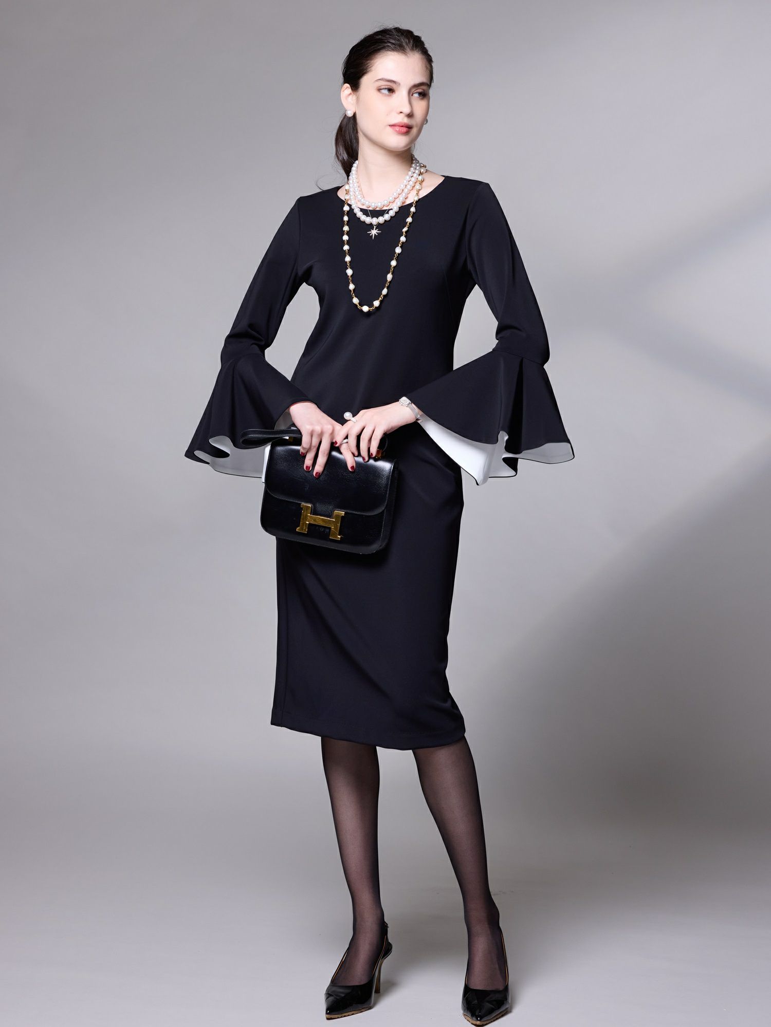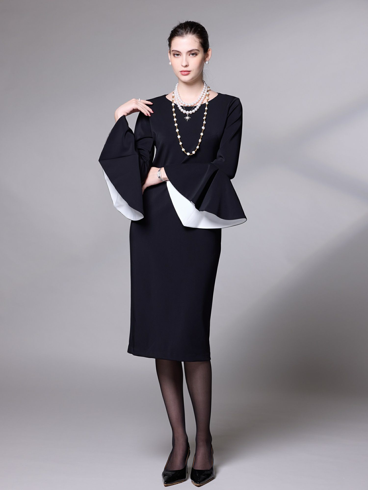 優雅に広がる袖フレアが印象的な、ドラマティックなブラックドレス。